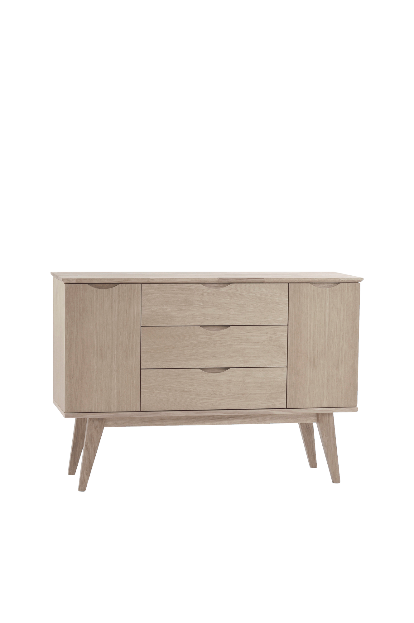 Stilrent sideboad i tidlös design med generös förvaring. Lackad topp och stomme i MDF med ekfaner. Tre mjukstängande lådor och två luckor med hyllor. Lätt utställda ben i massiv lackad ek. Bredd 122, djup, 40 höjd 85 cm. Montera endast benen.