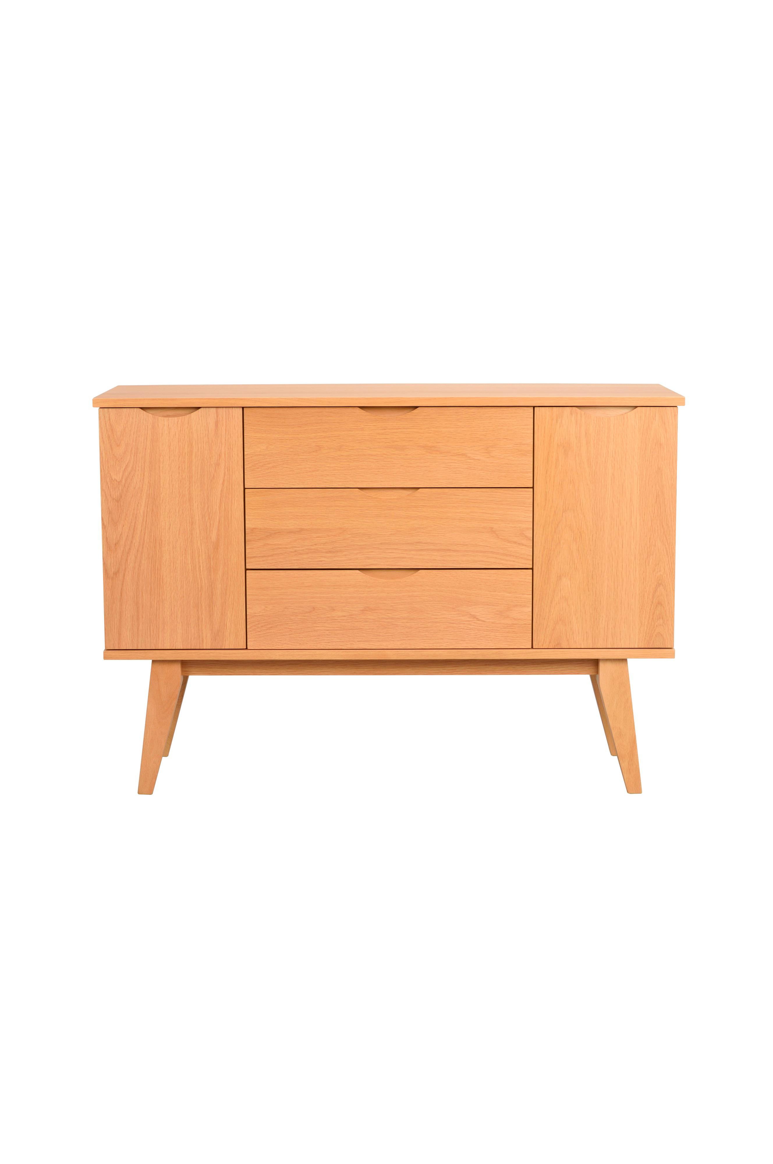 Stilrent sideboad i tidlös design med generös förvaring. Lackad topp och stomme i MDF med ekfaner. Tre mjukstängande lådor och två luckor med hyllor. Lätt utställda ben i massiv lackad ek. Bredd 122, djup, 40 höjd 85 cm. Montera endast benen.