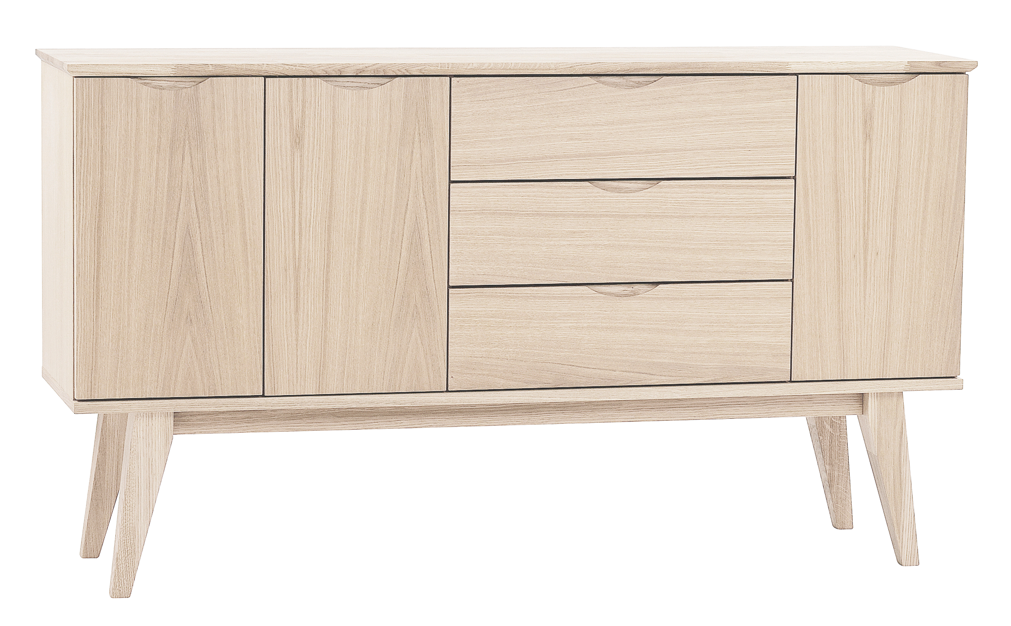 Stilrent sideboard med generös förvaring. Skåpet är i ek och har rymliga lådor och skåp med dämpande stängning. Benen är lätt utställda vilket ger ett modernt uttryck. Bredd 150 cm, djup 40 cm och höjd 85 cm. Sideboardet är monterat vid leverans.