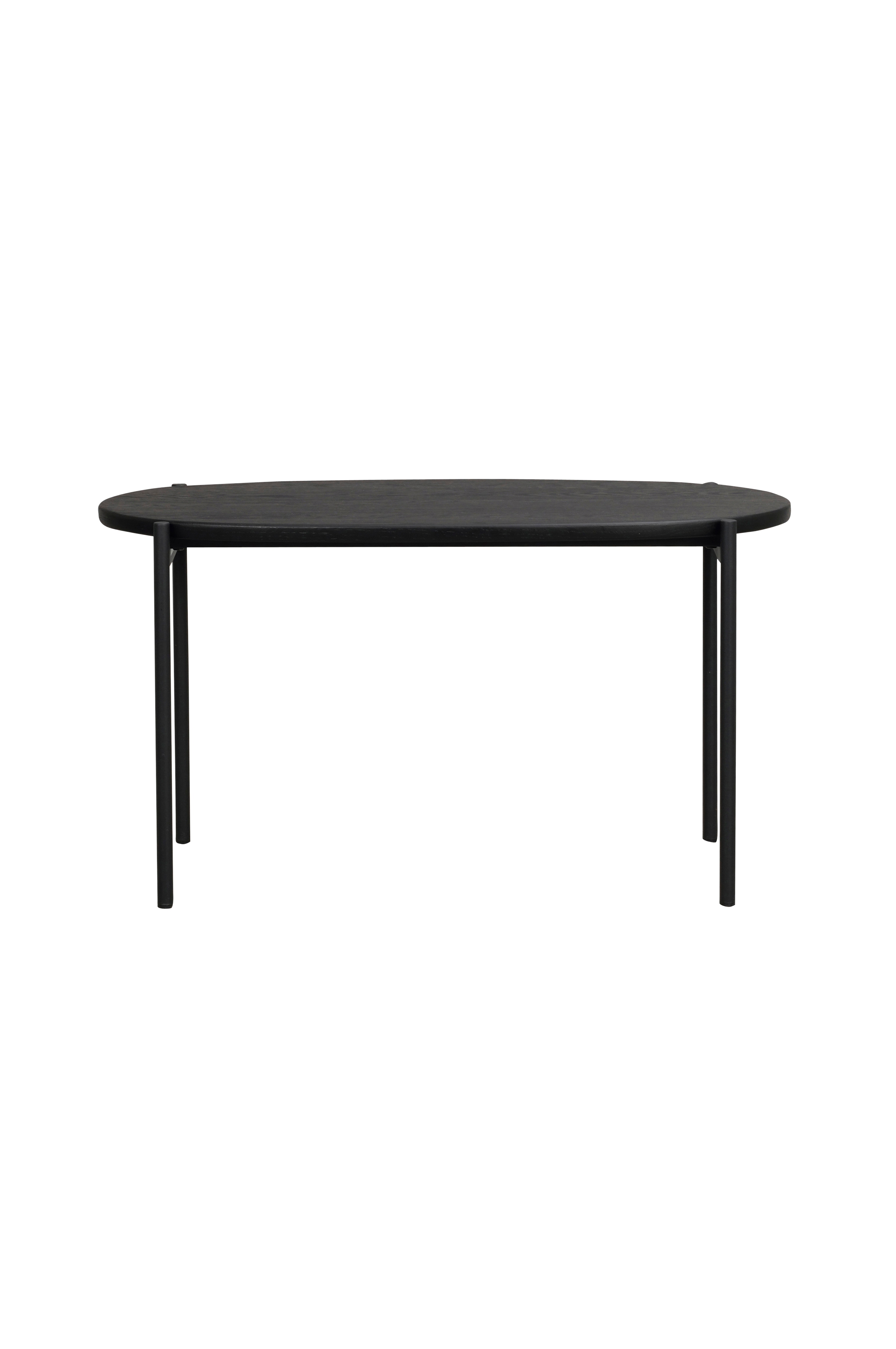 Skye ovalt soffbord i modern, stilren design med bordsskiva i borstad svartmålad ek faner och ben i pulverlackerad metall. Ställs som sidobord, litet soffbord eller som satsbord tillsammans med Skye soffbord 120 cm. Skye finns även som matbord.
