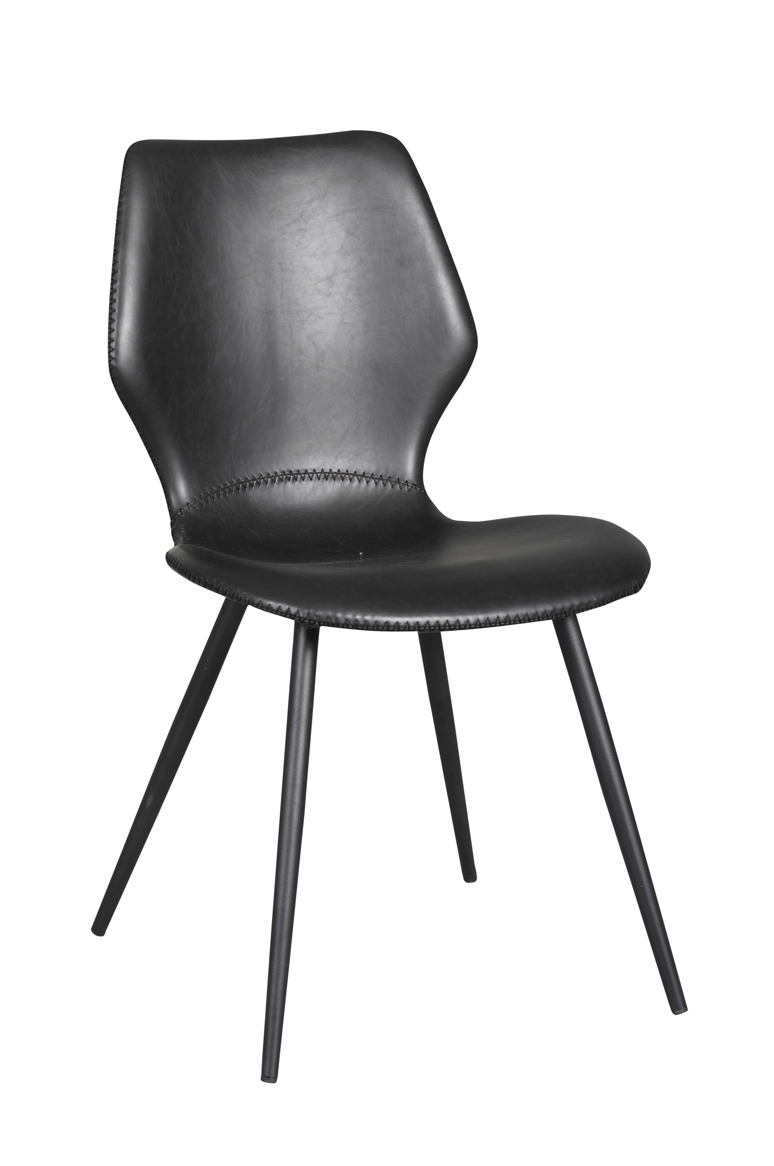 Stilren stol med spännande former. Sits i konstläder och lätt utställda ben i pulverlackerad svart metall. Bredd 47 cm, djup 56 cm, total-/sitthöjd 86 /46, sitt djup 46 cm. Monterad.