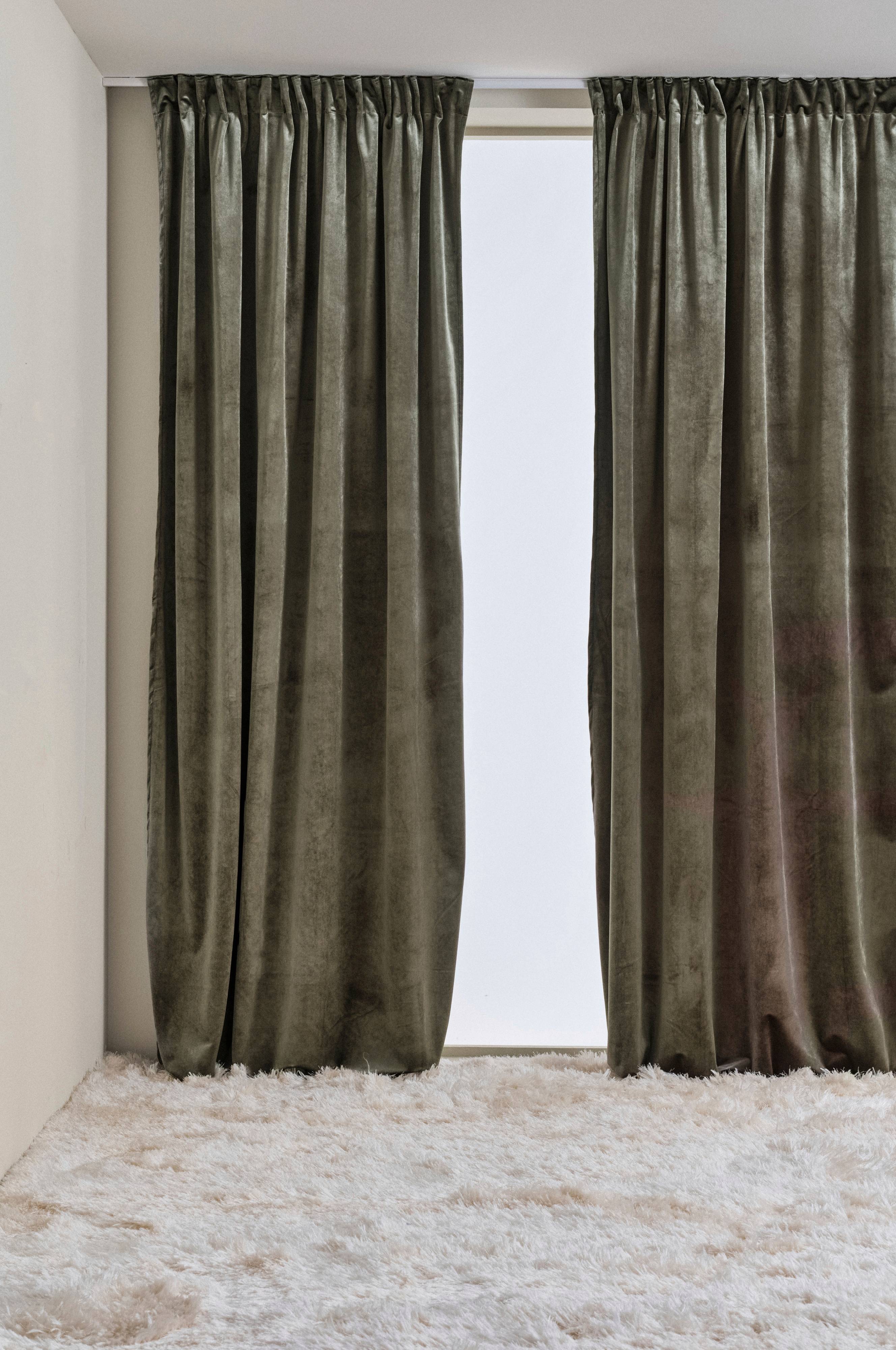 Två gardinlängder i elegant sammet av polyester. Sammetstyget skimrar vackert, färgnyansen upplevs olika beroende på hur ljuset faller. Längden har påsytt multifunktionsband. Gardinen kan hängas upp med fingerkrokar, kanal samt dold hälla.
