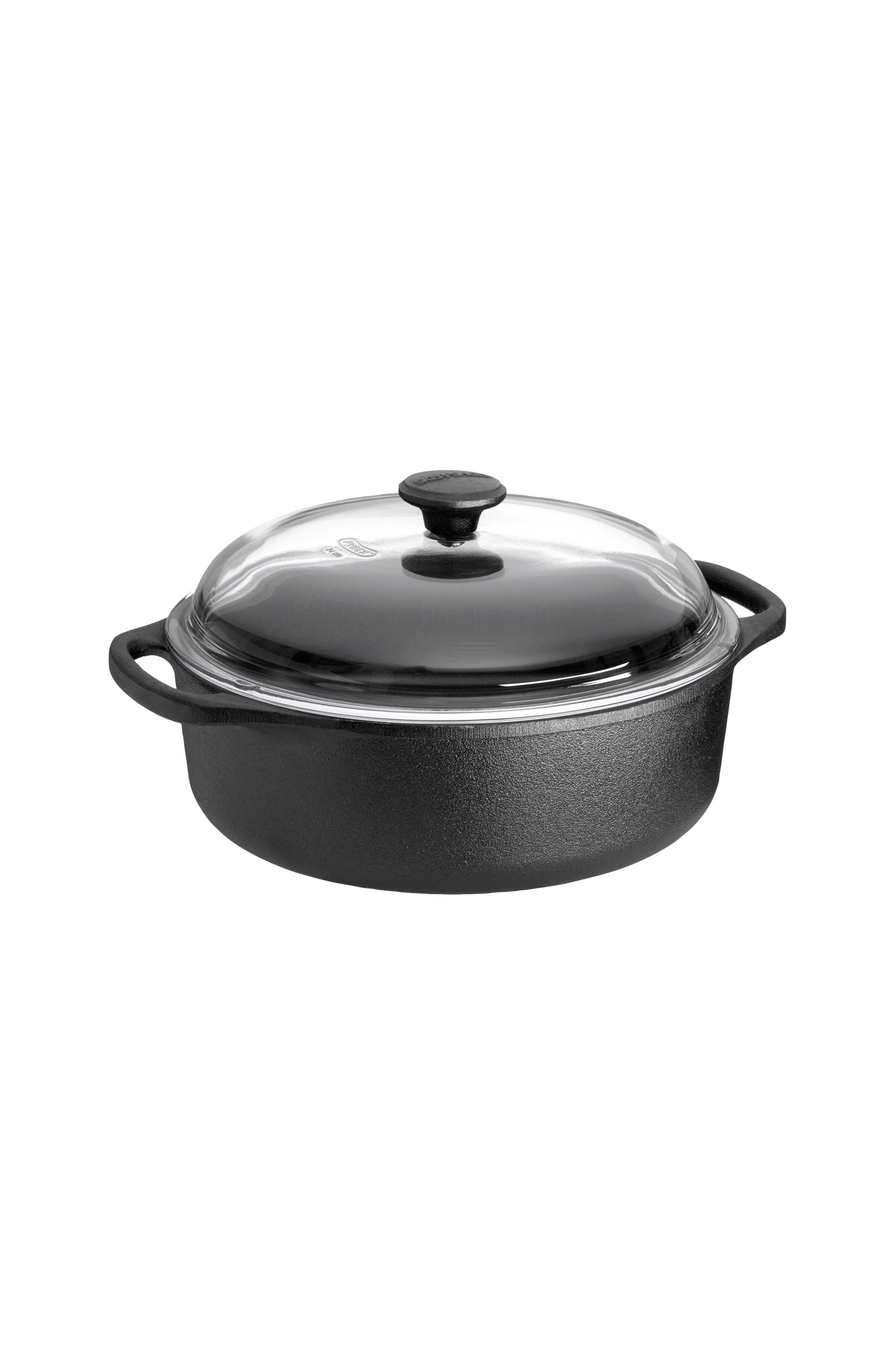 Gryta i gjutjärn med två gjutjärnshandtag och glaslock.