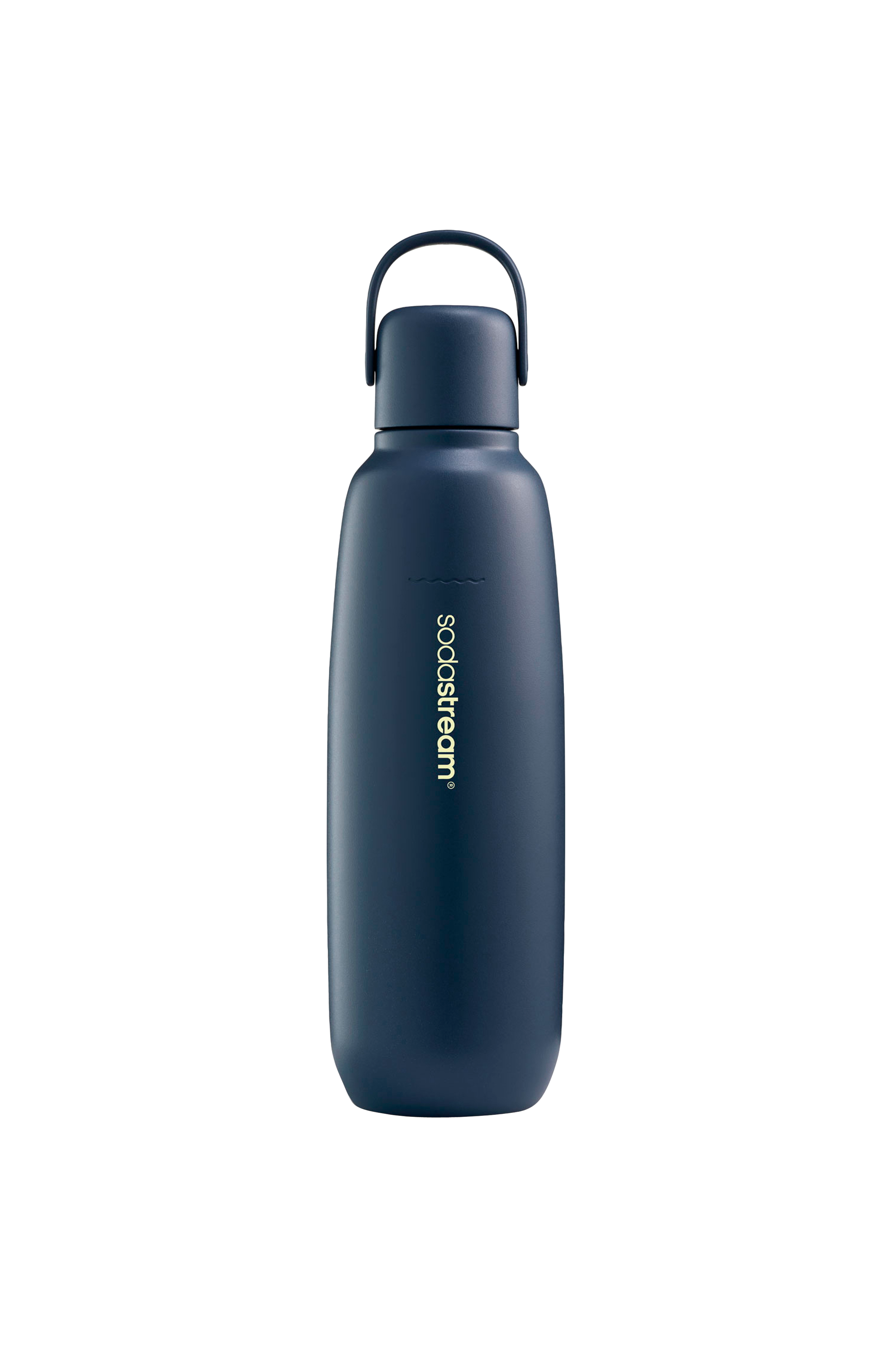 SodaStream fizz&go är en isolerande flaska gjord av rostfritt stål för att hålla dryckens temperatur upp till 12 timmar. Den är diskmaskinssäker och har ett mjukt handtag som gör den enkel att ta med.