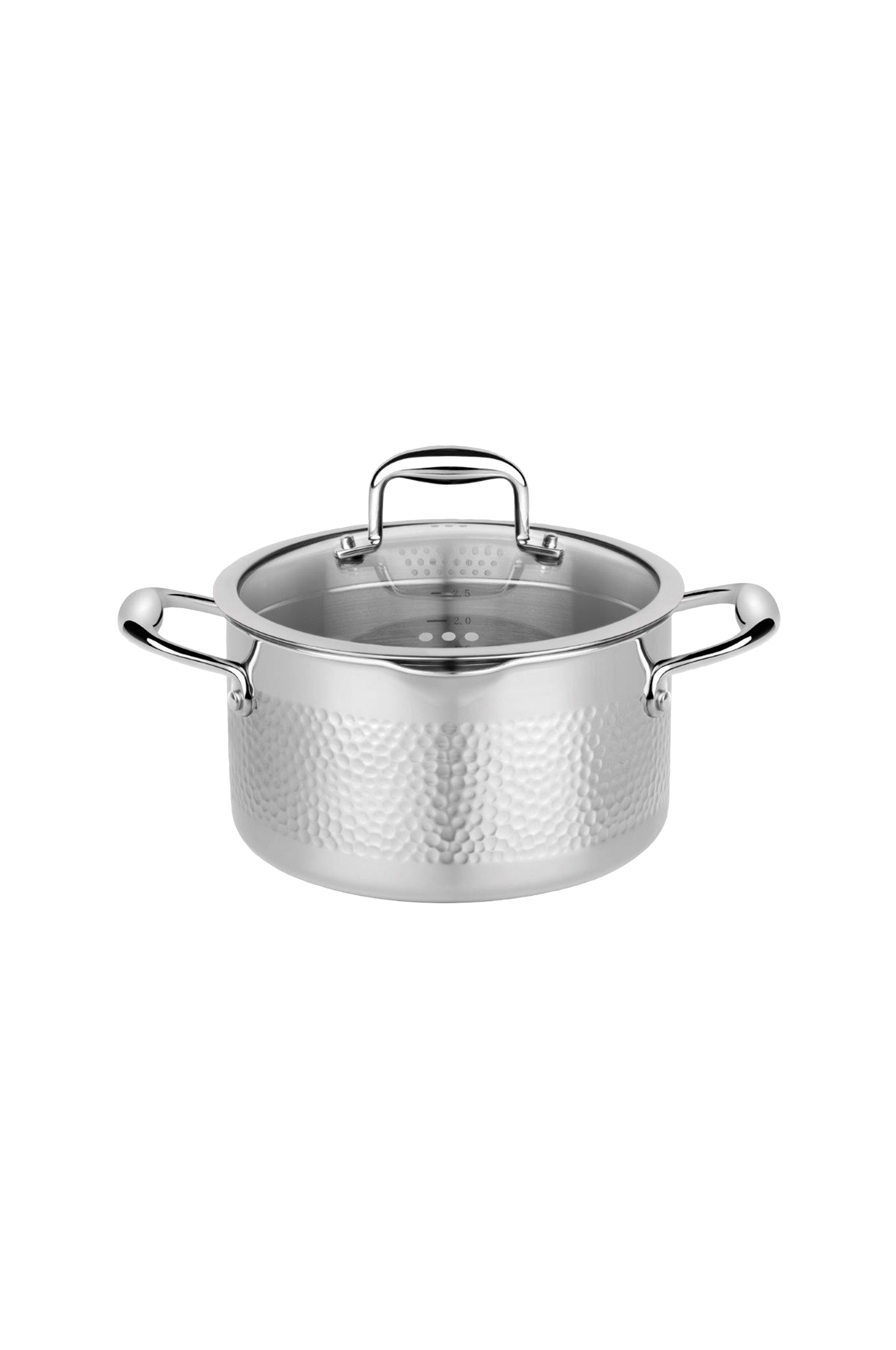 Den här vackra krukan i Noma-serien är tillverkad av det allra bästa 3-lagersmaterialet kombinerat med en mycket unik hammareffekt. Denna uppsättning är inte bara ett blickfång på ditt bord, utan är också mycket energieffektiv eftersom den är tillverkad med en vägg och botten i ett stycke. Detta gör den mycket speciell och säkerställer att värmen fördelas jämnt och att inga heta punkter uppstår. Pannan har en jämn värmefördelning och är därför mycket energieffektiv.