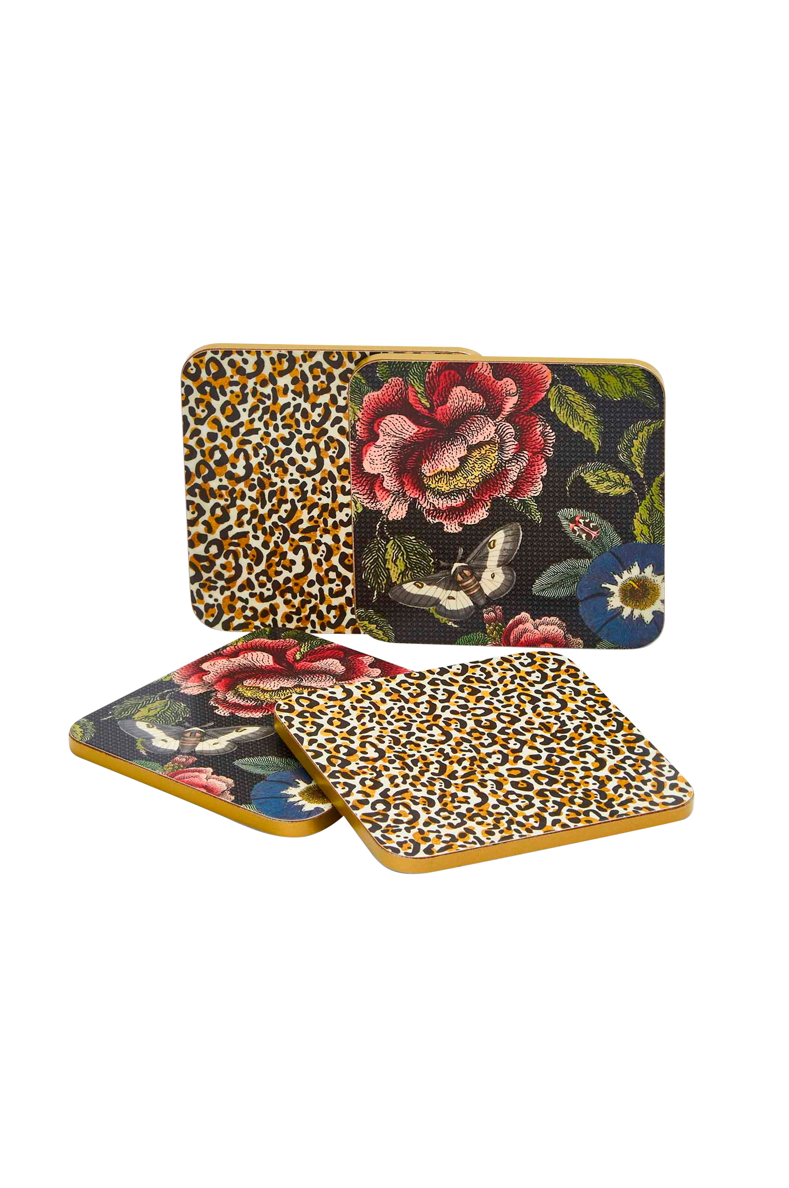 Mönstrade glasunderlägg från Spodes Creatures of Curiosity-kollektion. Underläggen är tillverkade av MDF-trä med en filtklädd undersida som gör att de ligger stilla på bordet.