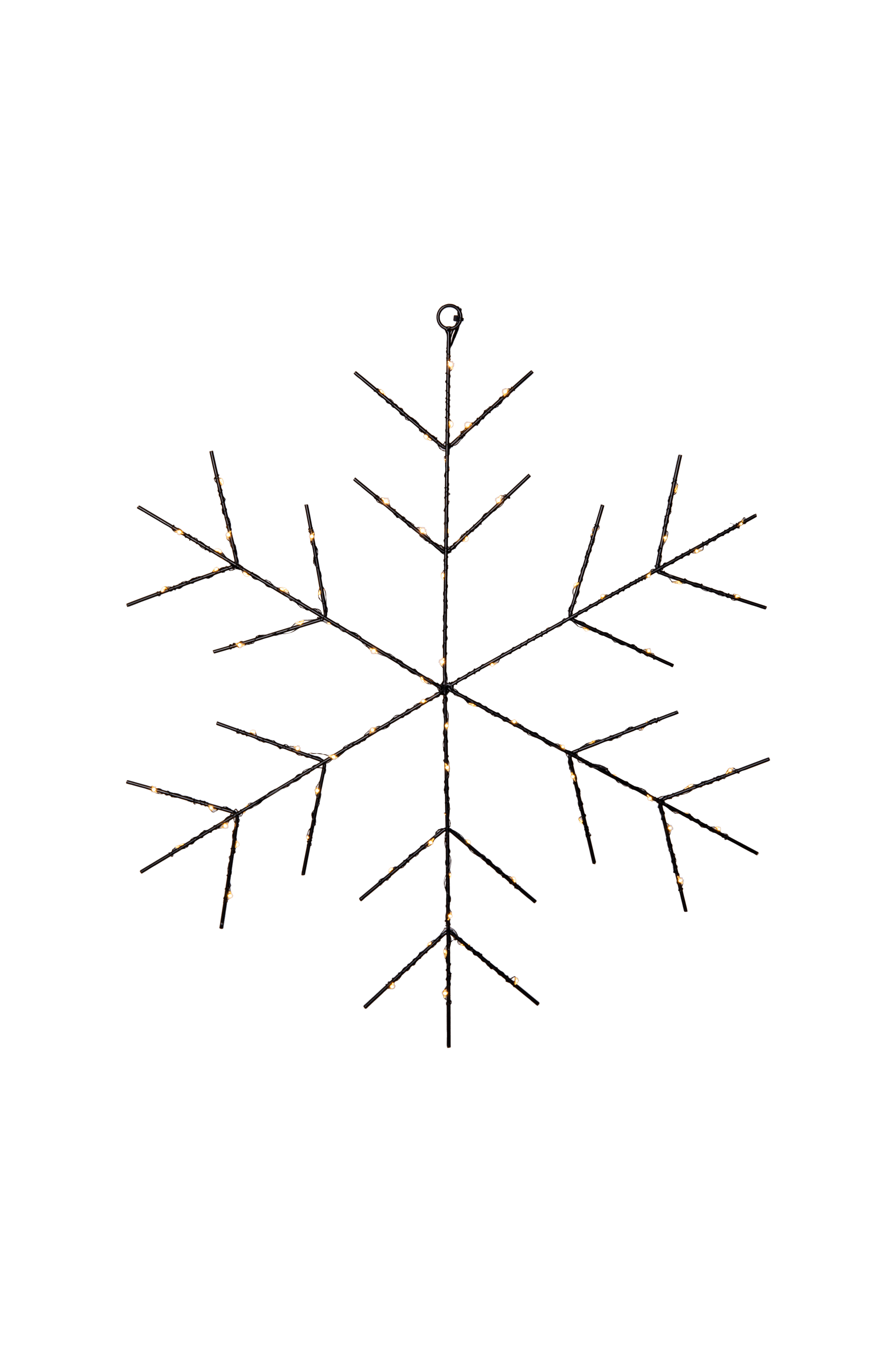 Självlysande snöflinga tillverkad av metall. Silhuetten har en påmonterad ljusslinga med små led-prickar som lyser med ett varmvitt ljus. Fin dekoration att hänga i fönstret och på väggen. Produkten har en timer och ljusstyrkan kan ställas in i tre olika lägen.