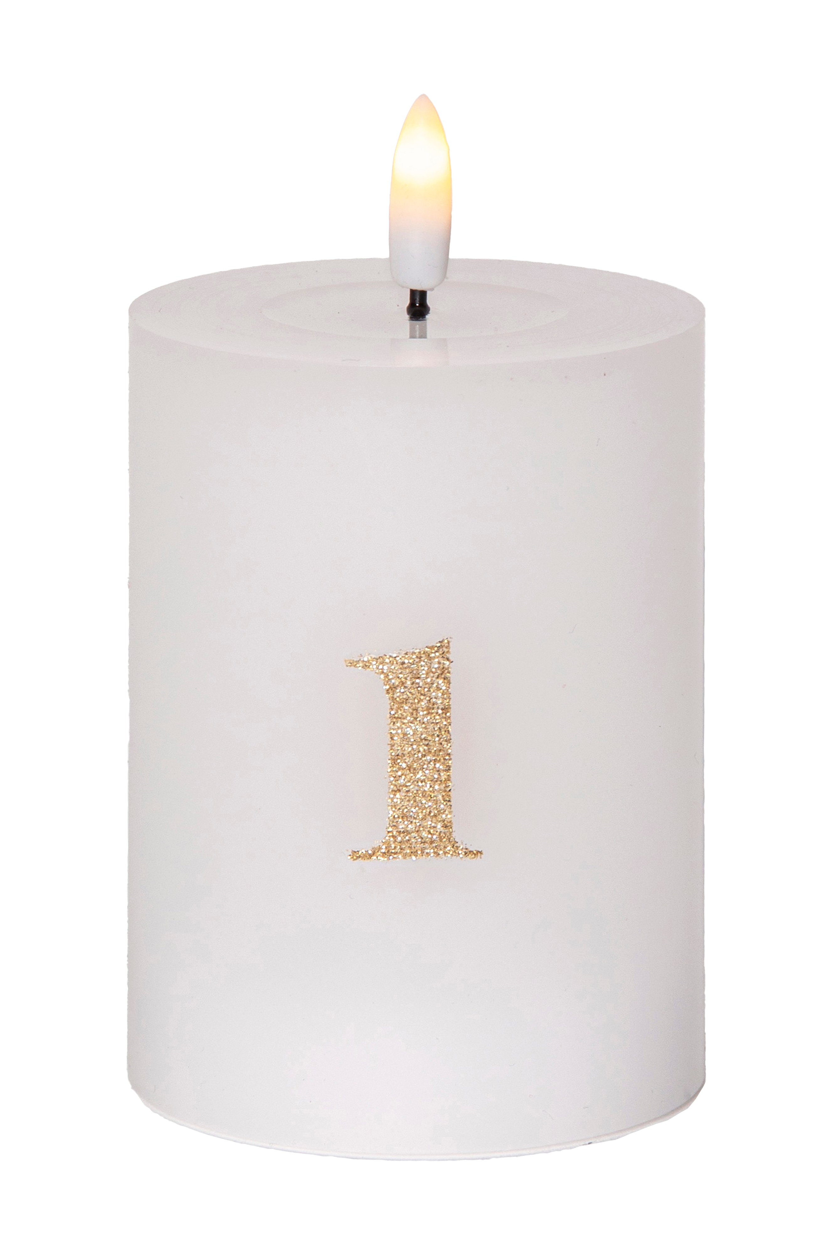 4 st vita ljus med guldfärgade siffror på. Med den medföljande fjärrkontrollen kan du enkelt tända ljusen ett och ett eller alla på samma gång. Ljusen har även en inbyggd timer. Ljusen drivs av 2xaa batterier för varje ljus och fjärrkontrollen av 1xcr2032, inga batterier ingår.