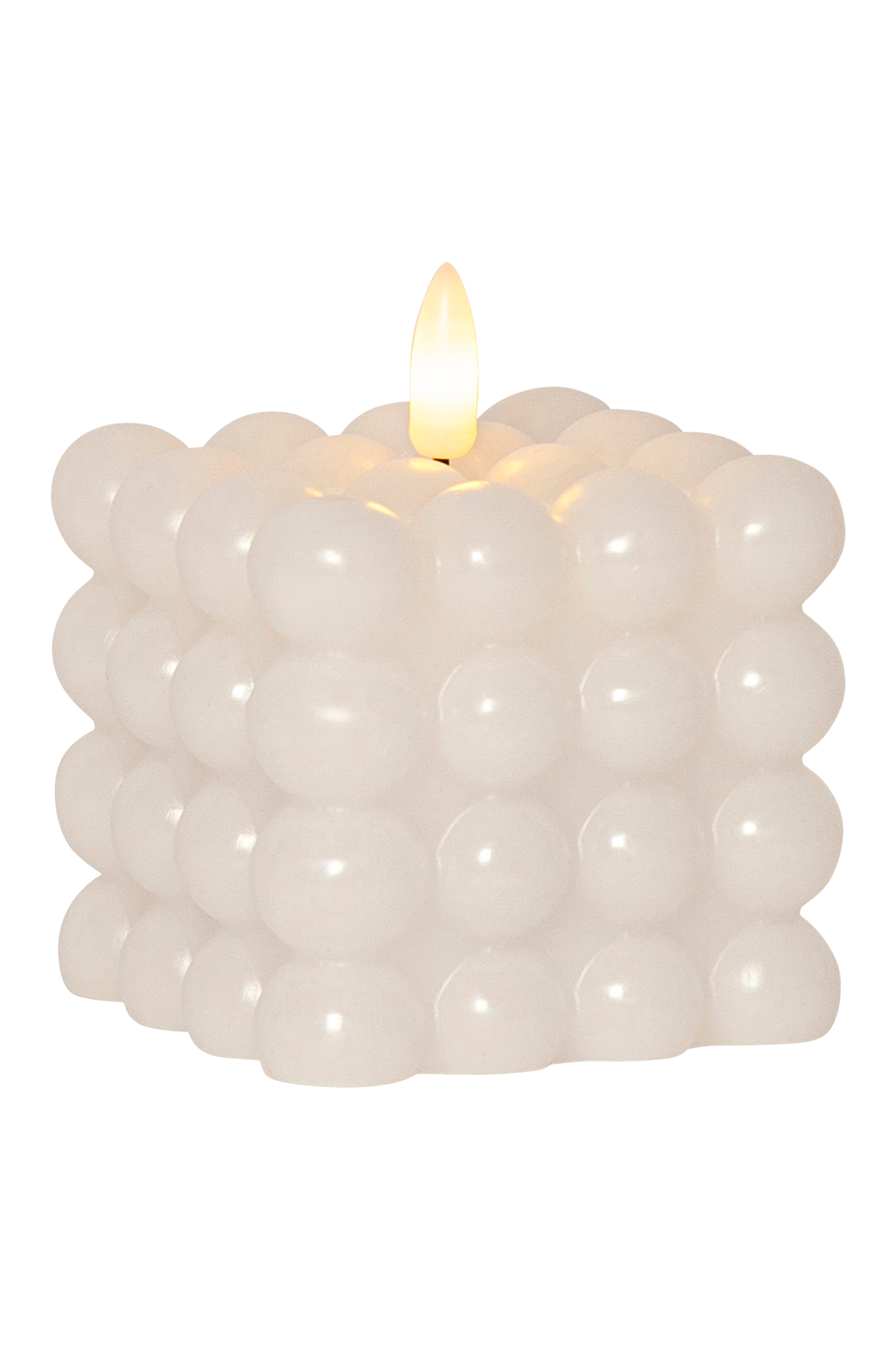 Ljus av vaxliknande plast, uppbyggt av runda klot till en fyrkant. Ljuset är batteridrivet och har LED-belysning, så det är helt brandsäker. Den naturtrogna lågan är av plast och har ett varmvitt sken. Timerfunktion gör det enkelt att ställa in när det ska lysa, intervallet är 6 timmar på och 18 timmar av, repeterande. För inomhusbruk.