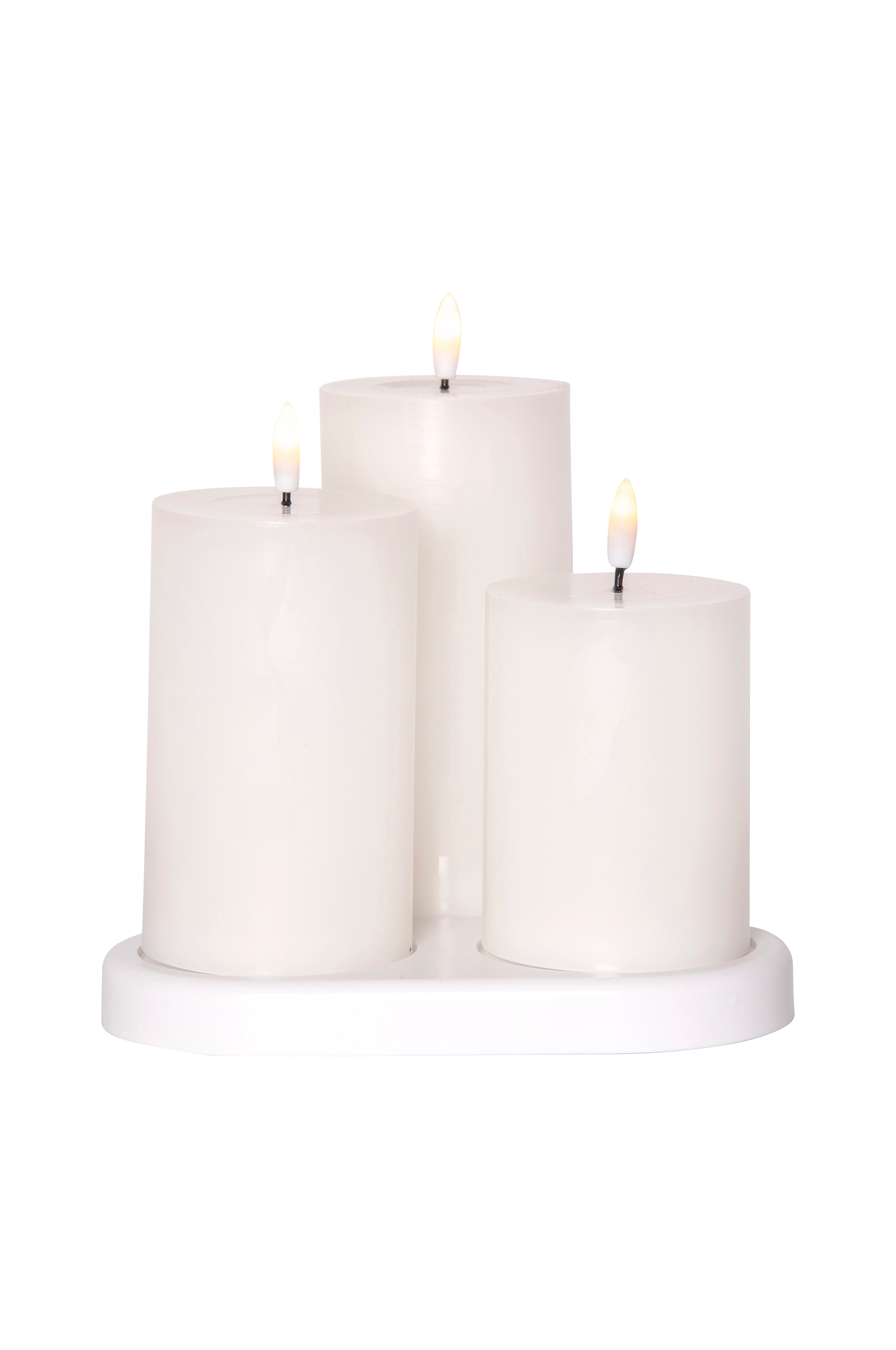 Flamme charge är ett uppladdningsbart set med vita blockljus, tillverkade i vax, i 3 höjder, 10, 12,5 och 15 cm. Laddningsplattan har även en medföljande 80cm lång kabel med usb a-usb c-kontakter som enkelt kan kopplas in i en 5v adapter, adaptern ingår ej. Indikatorlampan lyser grönt under laddning. Även om litiumbatterierna har överladdningsskydd, låt inte ljusen ladda längre än max 3 timmar! När de är nya räcker det med en laddning på max 1 timme.