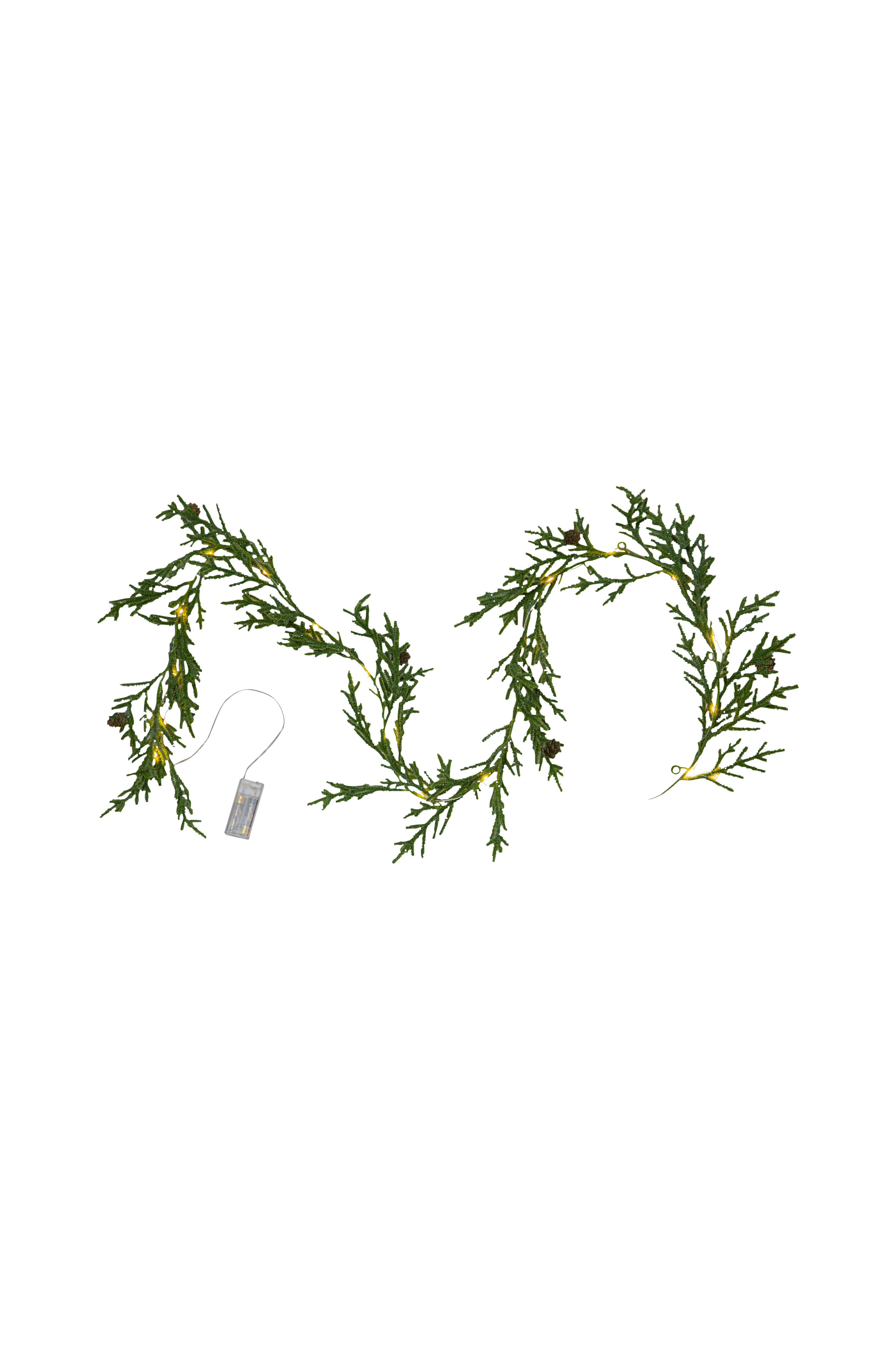 Girlang i PE material med lite glitter och små kottar. Lyser upp med 20 varma dewdrops. Längd 180 cm. Drivs med 2 batterier AA (ingår ej). Lampans spänning 3V. Volt 3V.