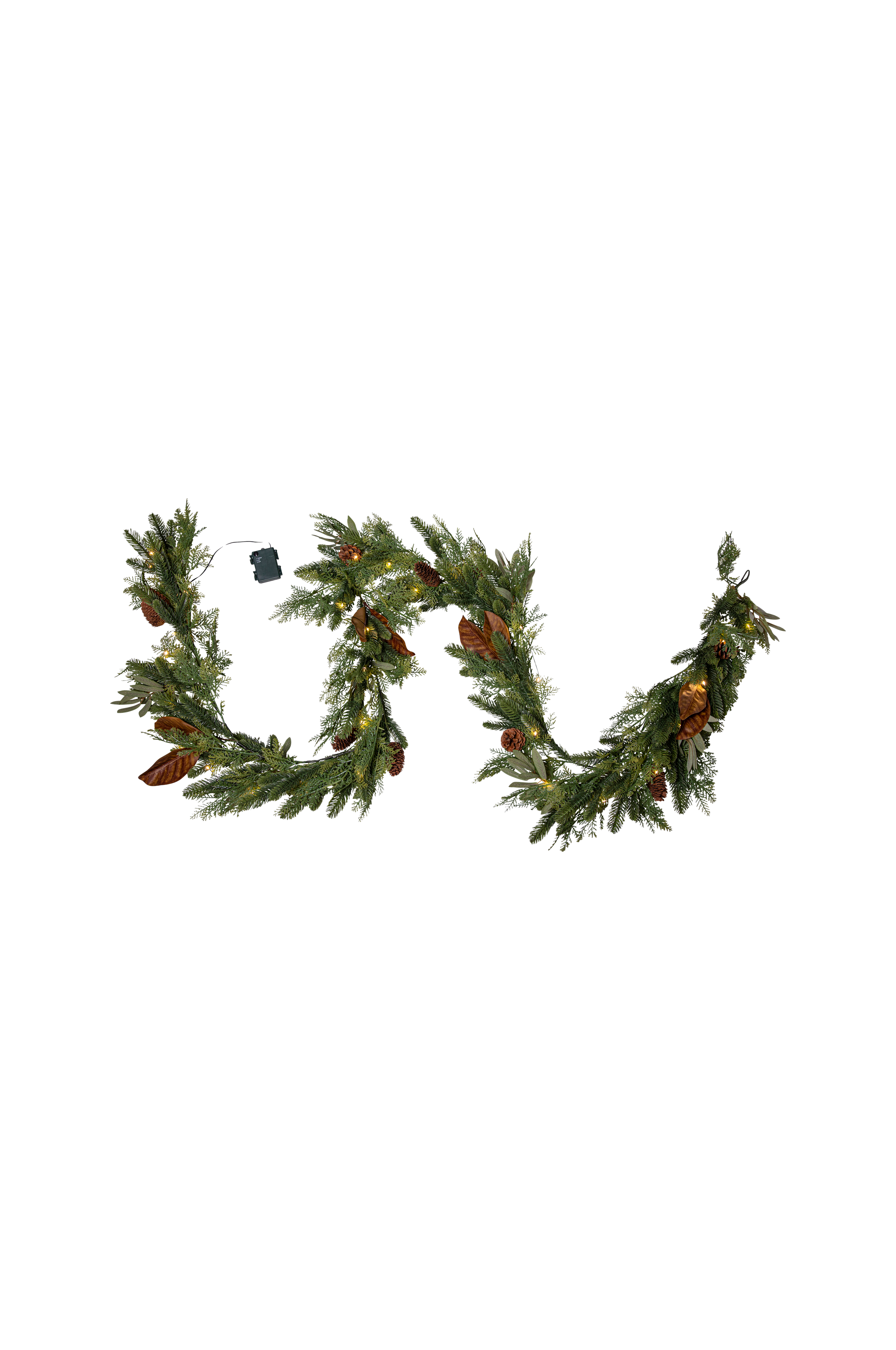 Mixi-girlangen är gjord av en blandning av blad och nålspetsar, tillverkade av pe-material. Den kommer att vara vacker som dekoration både inomhus och utomhus. Med 30 varmvita daggdroppar lyser den upp med ett fint sken, slingan drivs av 3 aa batterier, dessa ingår ej.