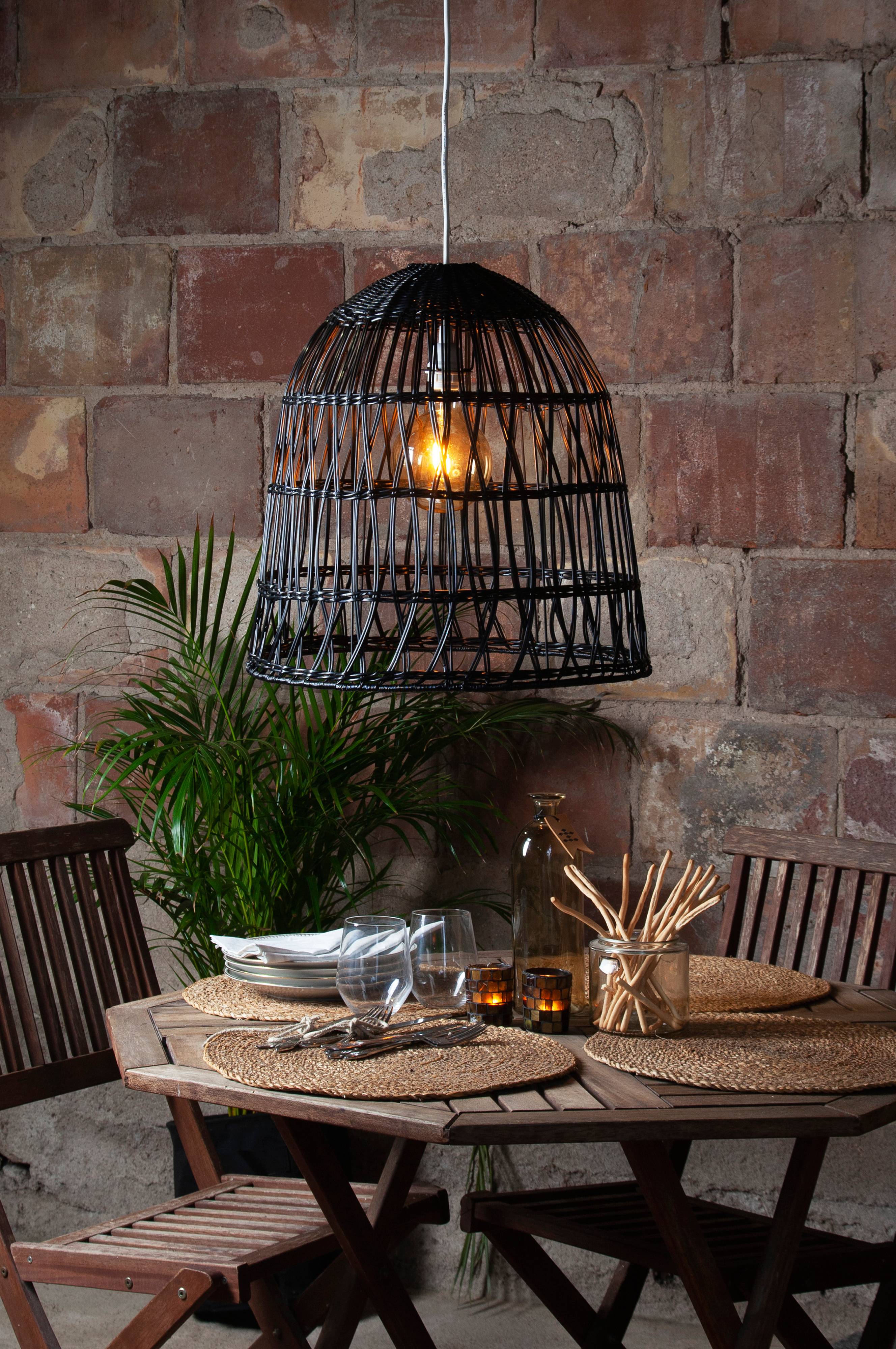Lampskärm i svart konstrotting för utomhusbruk. Sladd med sockel ingår ej. Köp till TRÅDEN sladd för utomhusbruk, med E27 sockel.