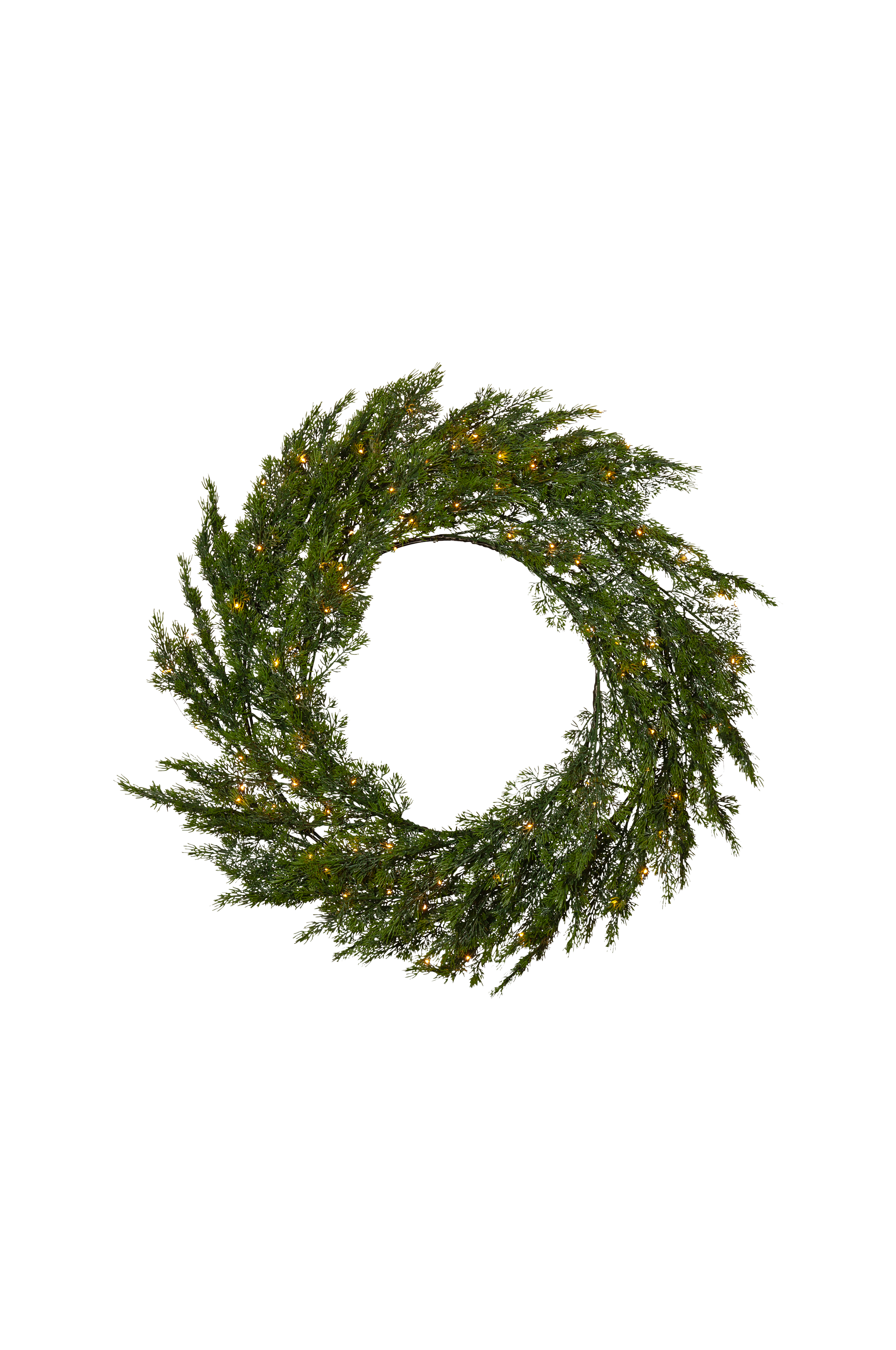 Thuja krans med diametern 80 cm har grenar som ser ut som tujabarr. Dessa är gjorda i PE material, vilket är ett bra miljöval. Med 80 varmvita ljuspunkter går den att använda både som en dörrkrans utomhus eller som en väggkrans inomhus. Den drivs av en transformator som går att använda både inomhus och utomhus.
