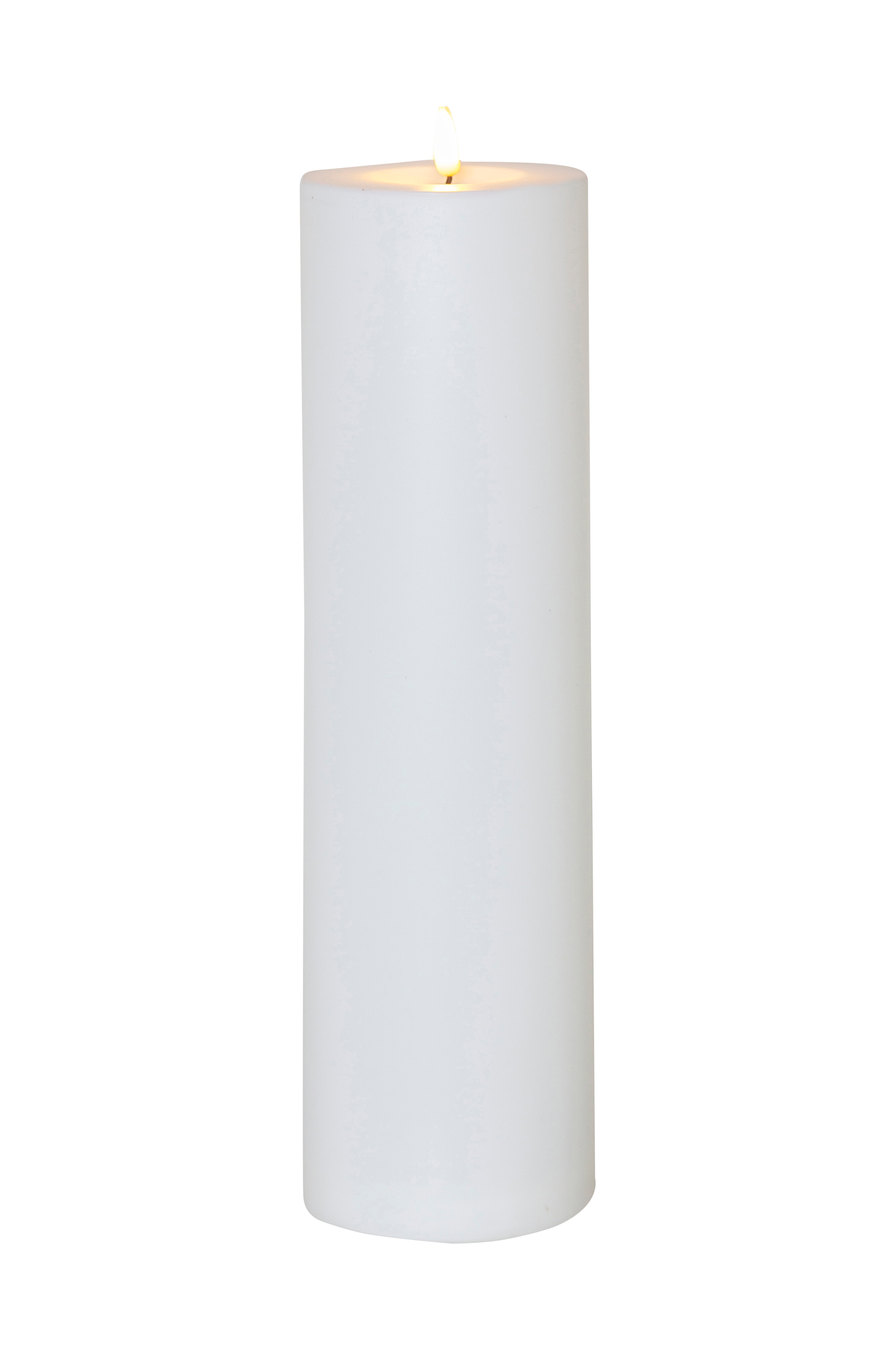 Flamme rak är ett vitt ljus i plast med vår naturtrogna flamme låga. Detta ljus passar lika bra inomhus som utomhus, i en lykta eller i grupp med andra uteljus från flamme familjen. Detta elektriska ljus går att använda både med ljussensor och med timer. Önskar man sensor så sätts brytaren på on läget, ljuset lyser då upp när mörkret faller. Sätter man brytaren på timer i stället så lyser ljuset i 6 timmar, sedan slocknar den i 18 timmar och lyser upp nästkommande dag igen.