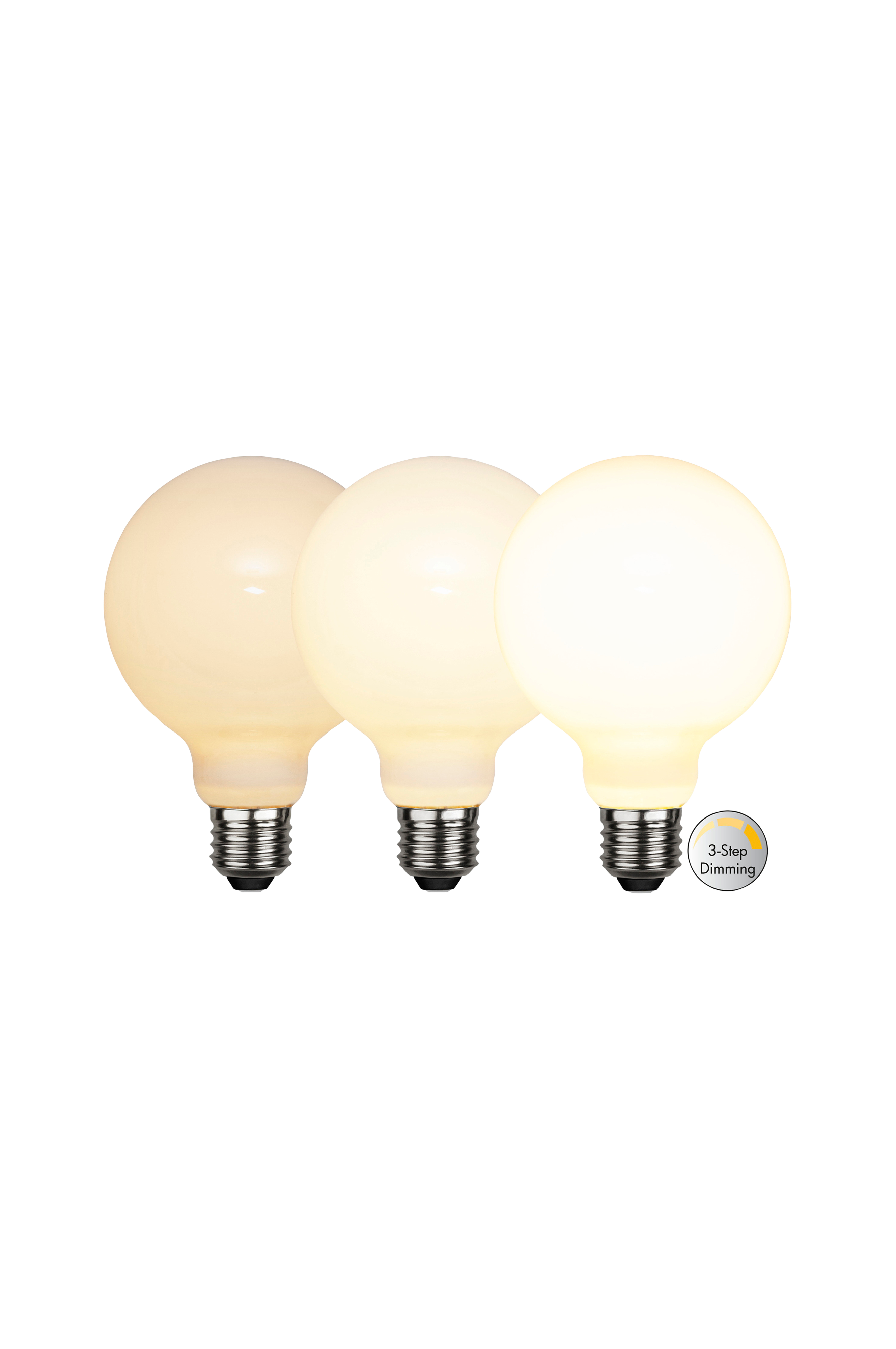 Opal ljuskälla med 3-stegs klickdimring. Ljusstyrkan ändras enkelt genom slå av och på strömbrytaren. Välj mellan 80lm, 400lm eller 800lm. Ljusfärgen är 2700K och den har E27-sockel. Startar alltid på lägsta ljusstyrka.