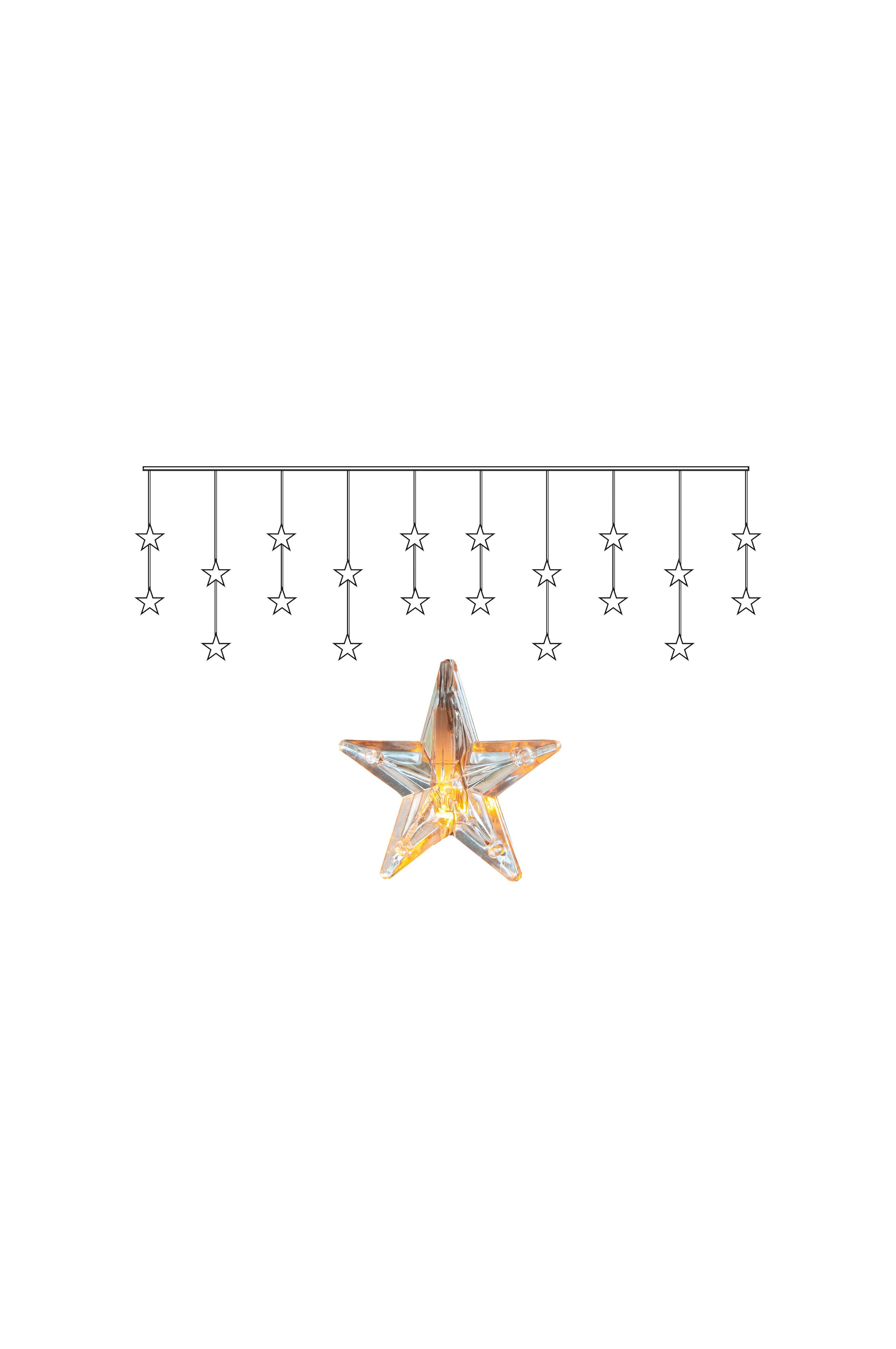 Transparent stjärngardin med varmvit glans för inomhusbruk. Placera gardinen i fönstret som en vacker dekoration med ljus. Stjärngardinen har 20 LED-ljuskällor.