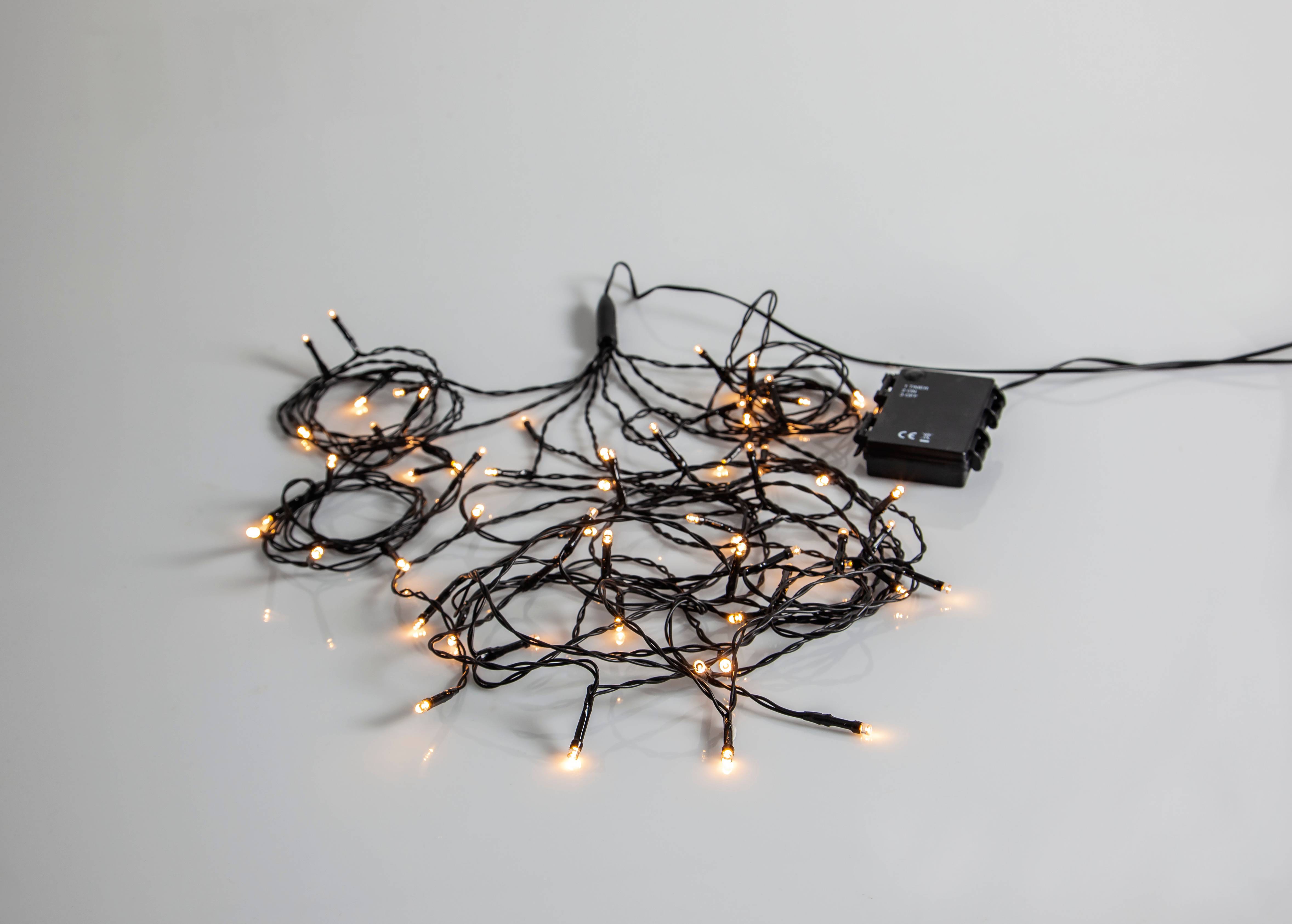 Slinga med 64 varma ljuspunkter med batteribox för både inom- och utomhusbruk. För optimal livstid av batterierna har slingan repeterande timerfunktion, 6 timmar på och 18 timmar av. Utmärkt att använda som parasollslinga under sommartid och som granslinga till jul. Drivs med 3 batterier AA (ingår ej). Ljuskälla ingår. Integrerad strömbrytare. Lampans spänning 3.1V. Volt 4,5V. Avstånd mellan lampor 17 cm.