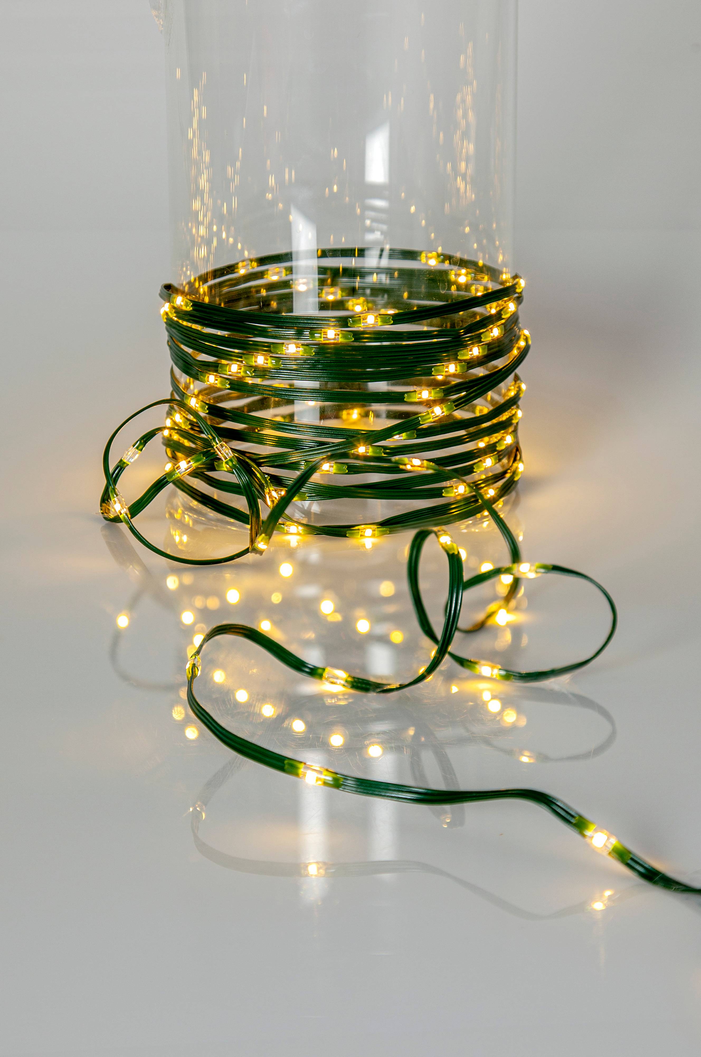 Tunn platt slinga med små ljuspunkter för utomhusbruk, perfekt och enkel att använda i träd, buskar, trappräcken mm. Grön kabel med 480 multifärgade led, 7,5 cm mellan varje lampa ger en slinga på ca 36m.