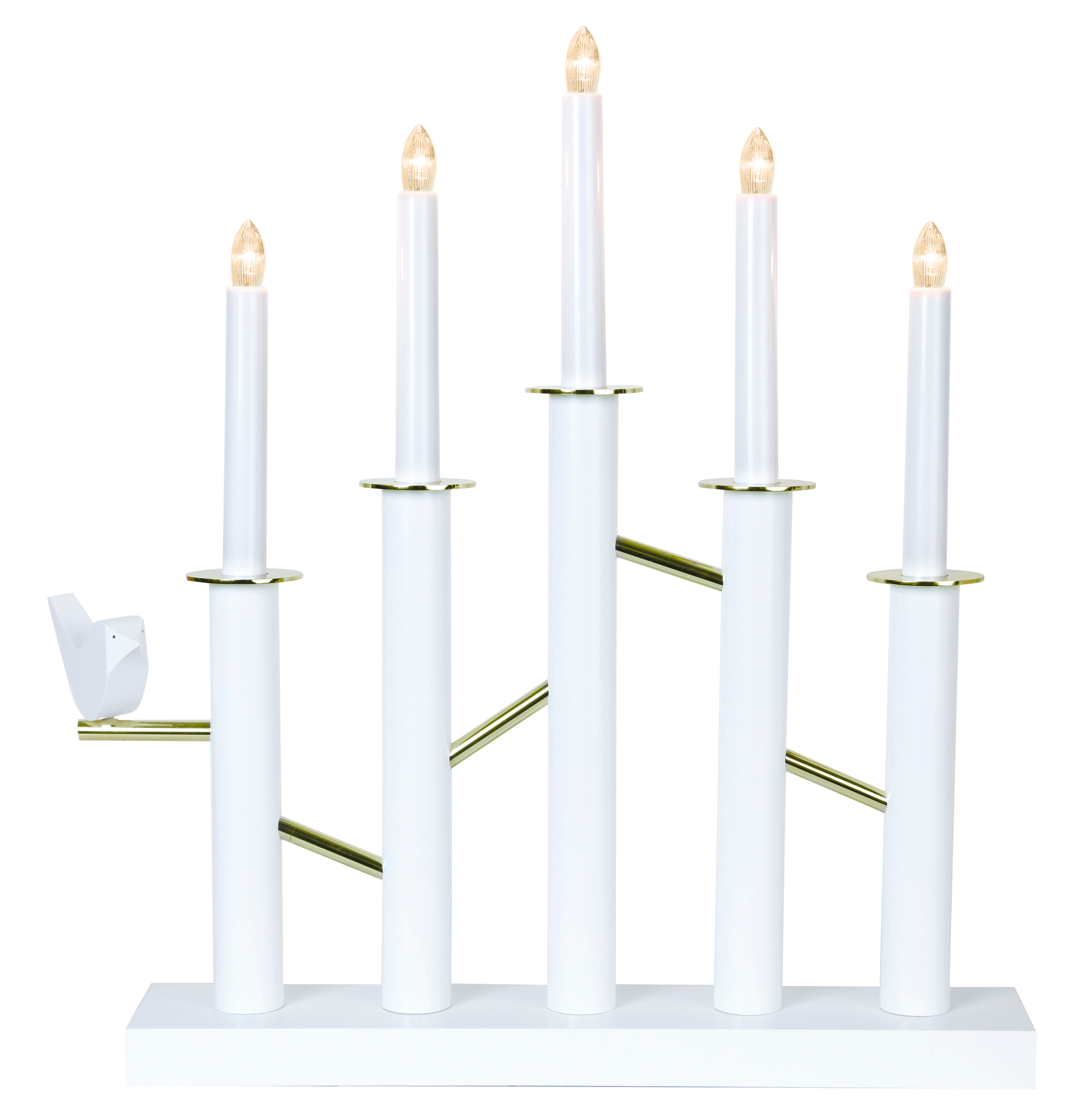 Mått: bredd 45 cm, höjd 39 cm. Trä och metall. Birdy, exklusivare 5-armad ljusstake i mässing och trä. LED lampor. Sladdlängd 1,8 meter.