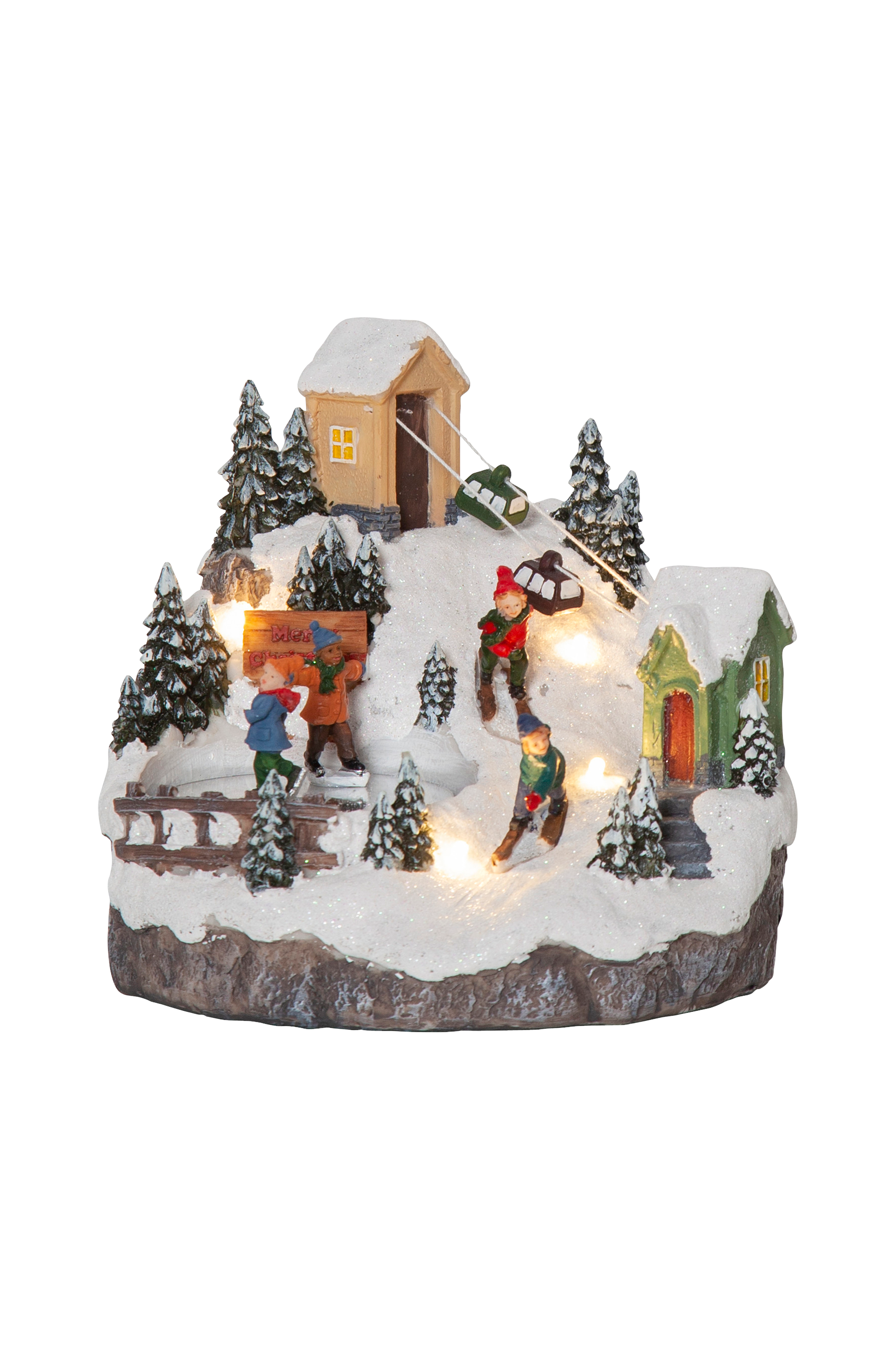 Juldekoration, vinterlandskap med linbana, skidåkare och skridskobana. Det lyser fint i snön av små led lampor. Skridskobanan roter. Dekorera till advent och jul och få en härlig julkänsla som passar både barnrummet och på en hylla eller skänk.