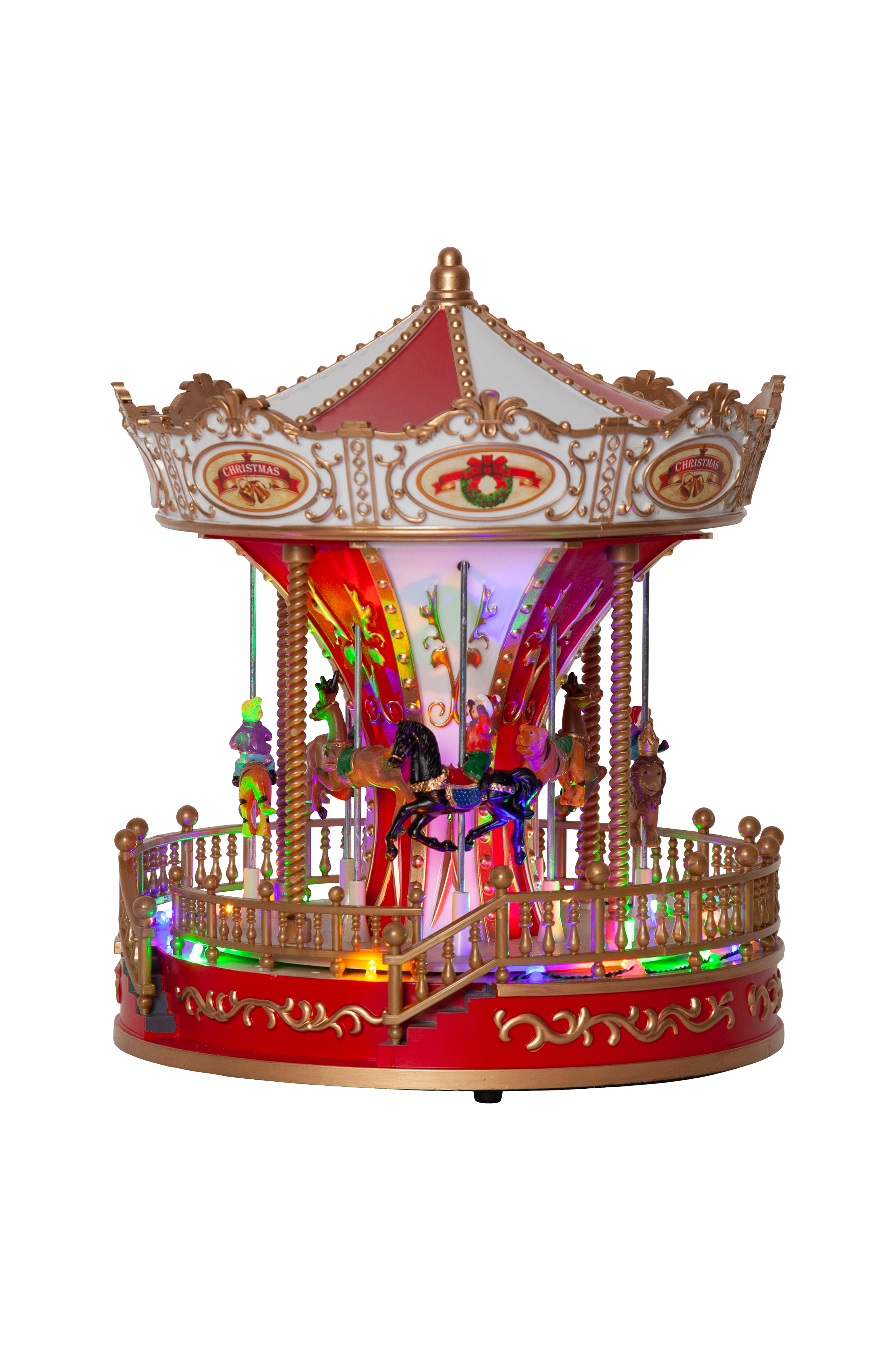 Perfekt jul dekoration med fina detaljer, snurrande karusell med 8 olika julsånger. Välj mellan funktionerna ljus eller ljus/rörelse/musik. Placera den på ett bord och du får en härlig julkänsla. Drivs av 3 AA batterier, ingår ej. Timerfunktion.