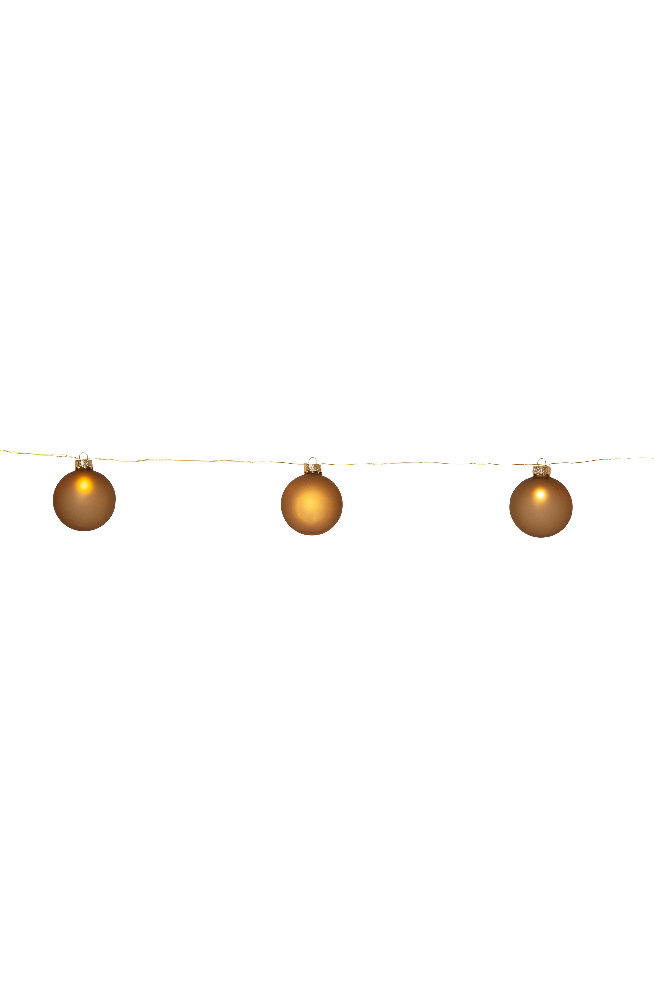 Vacker batteridriven ljusslinga med 8 st glaskulor. Mässingsfärgad slinga med små ljuspunkter i varmvit LED. Perfekt för tex bordsdekoration och julgransbelysning och ger en härlig stämning i hemmet. För inomhusbruk. 3 batterier AA ingår ej.