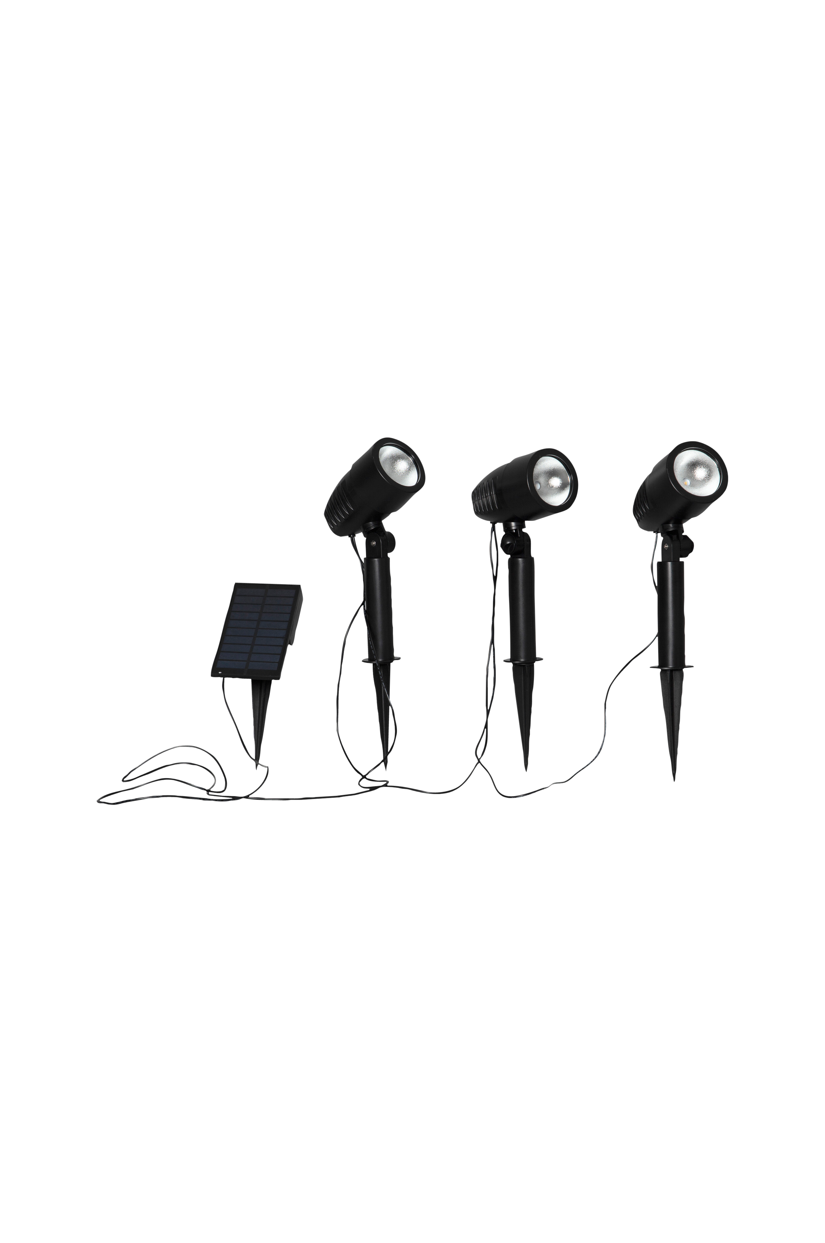 Solcellsbelysning som består av 3 spotlights som sitter ihop med 1 meter kabel emellan. Solcellslamporna lyser upp i din trädgård eller på terrassen med 75 lumen i mörkret och är ett bra val för riktad belysning mot en buske eller ett träd. Själva paneldelen sitter med 2 meters kabel från den sista spotlighten detta gör det enkelt att placera panelen i direkt solljus vilket är nödvändigt för att ladda batterierna som medföljer.