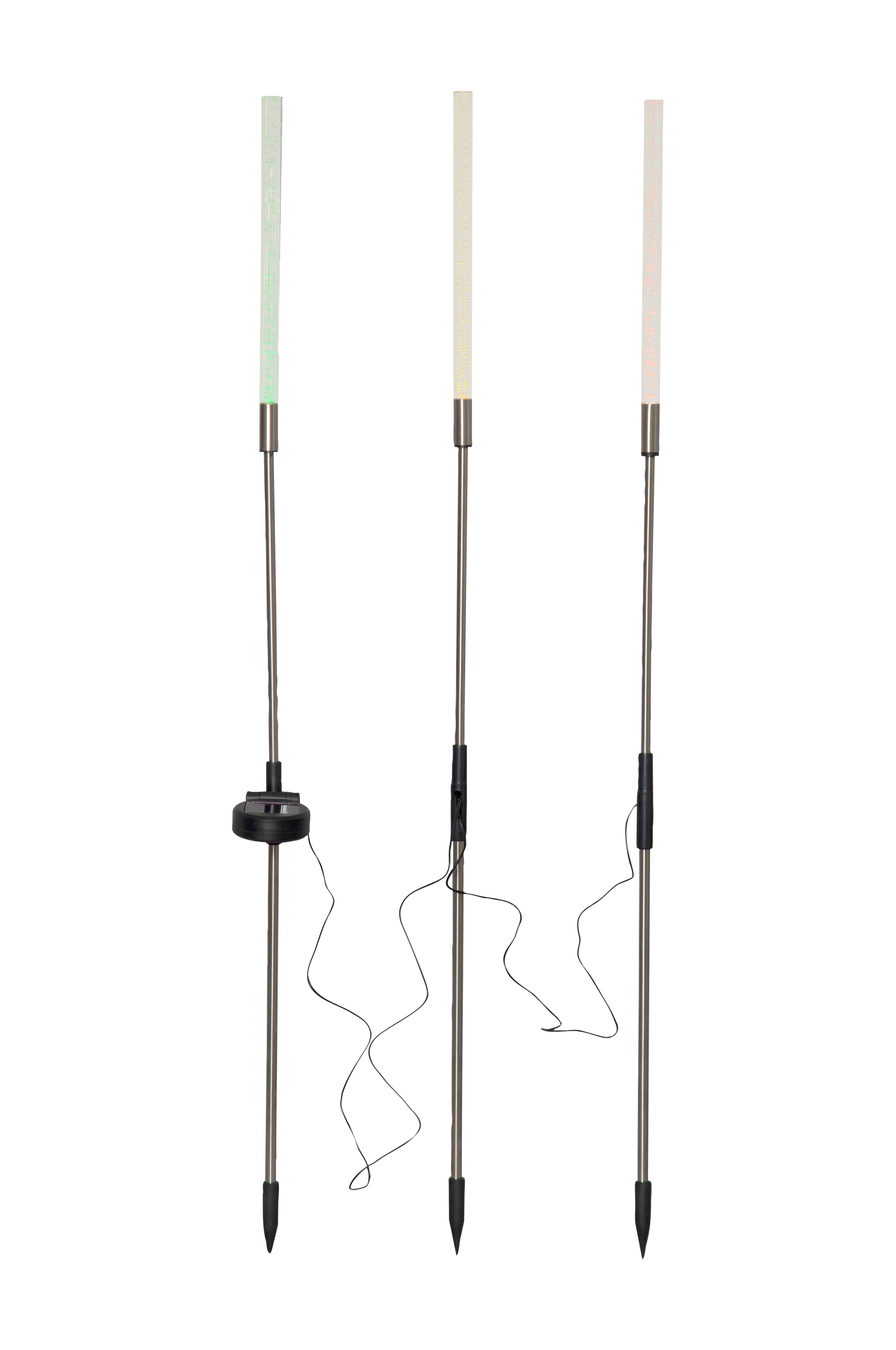 Vår vackra solcellsdrivna dekoration Bubbly 3-Pin lyser upp i mörkret. Denna solcellsbelysning har 3 pinnar i en höjd av cirka 80cm och 1cm i diameter som lyser med ett varmvitt sken igenom den bubbliga akryltoppen. De 3 solcellspinnarna sitter ihop med svart kabel och den totala längden blir ca 160cm, 90cm mellan 1a och 2a pinnen och 70cm till den 3e pinnen. Denna solcellsdekoration är fin att dekorera med i trädgården eller på en balkong. Själva paneldelen går att vinkla så att solen lätt kommer åt att ladda batteriet som medföljer.