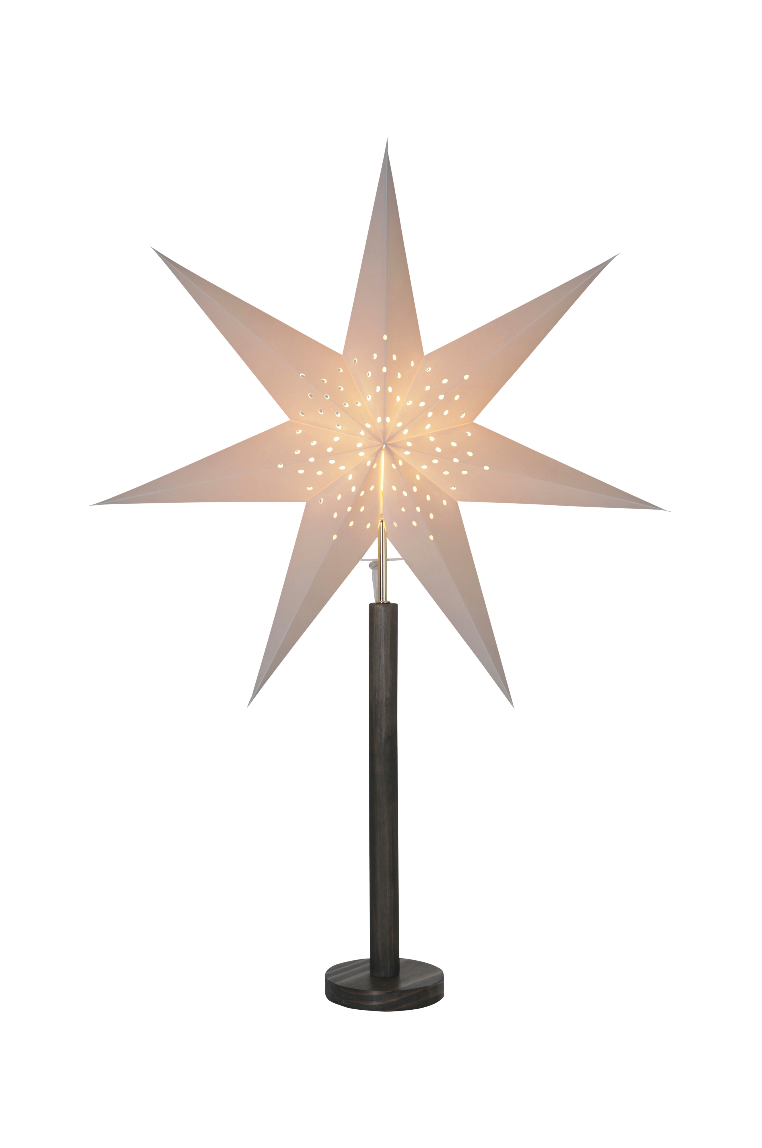 Stjärna på trä fot för inomhusbruk. Gör sig väldigt bra i ett fönster och på ett bord. Sprider mysig stämning i hemmet. Bredd 60, djup 16 höjd 85 cm. 1,8 cm sladd med strömbrytare.
