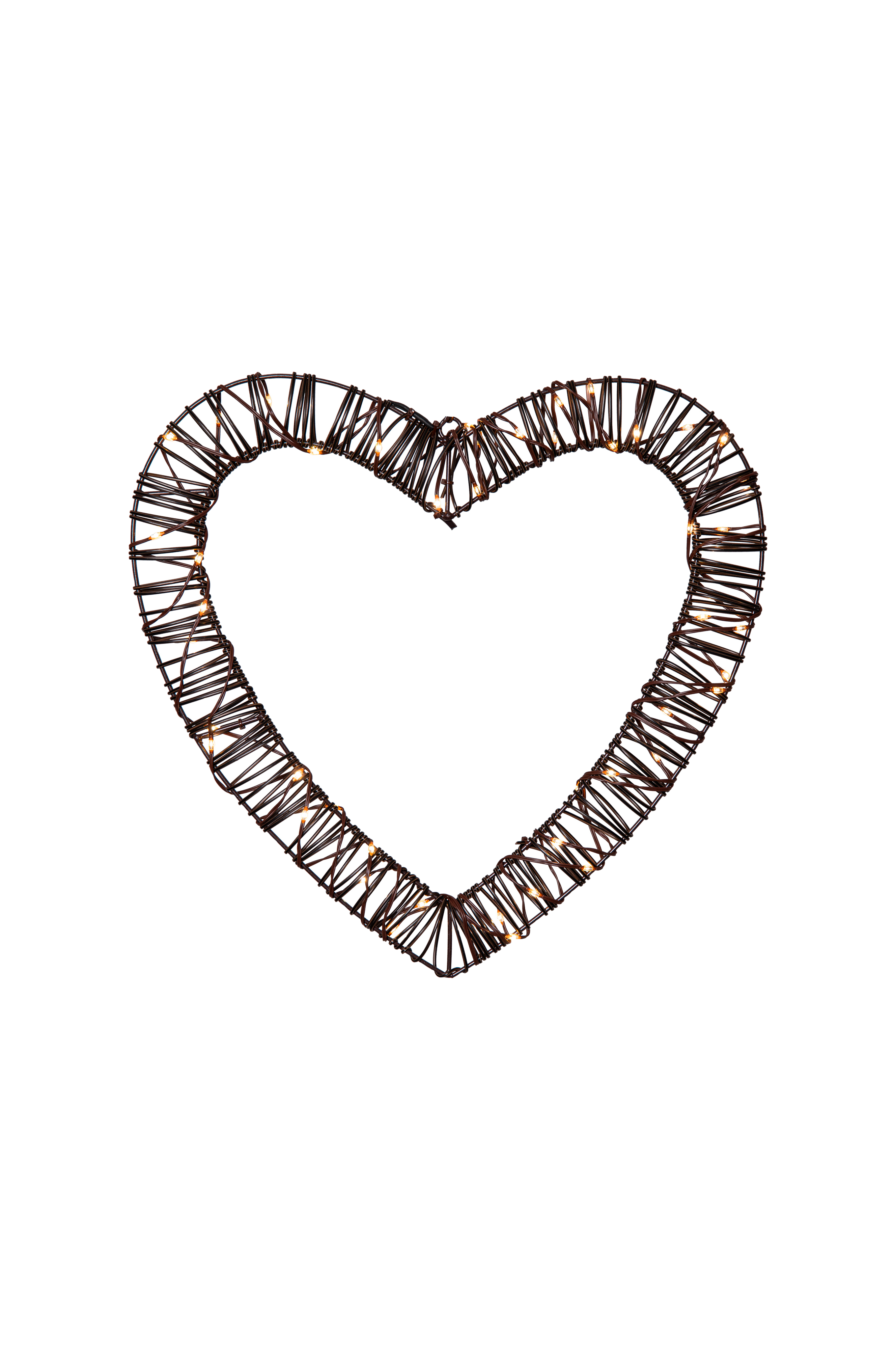 Hjärta i metallram med brun konstrotting, 50 varmvita lysdioder och batteribox för utomhusbruk med timerfunktion. Snyggt att placera på en vägg eller dörr.