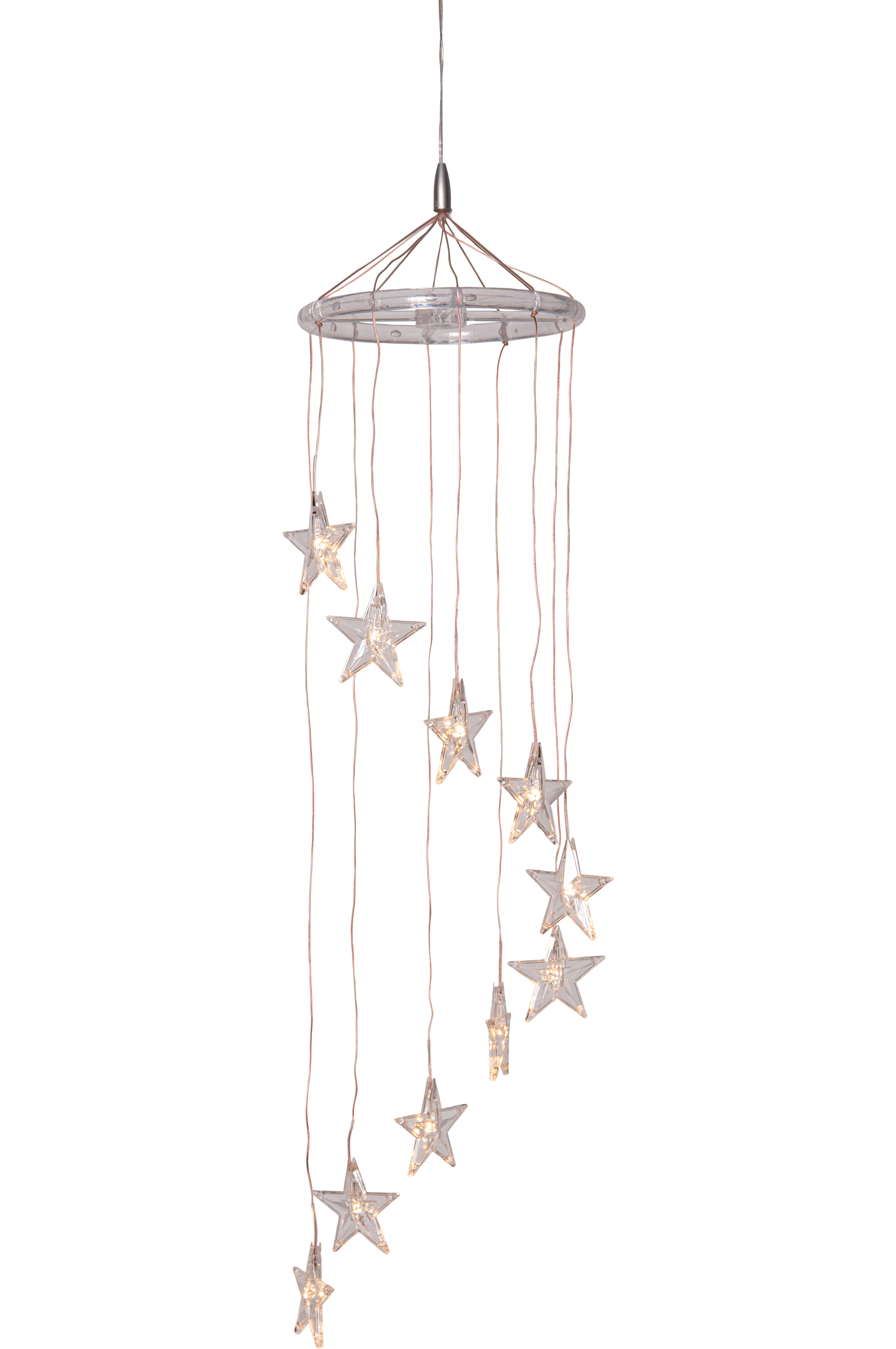 Batteridriven dekoration i form av en mobil, 10 varmvita lysdioder med en transparent stjärna över. Batterilådan är lämplig för utomhusbruk, men produkten passar lika bra inomhus. Timerfunktion, 6 timmar på 18 timmar av, upprepa.