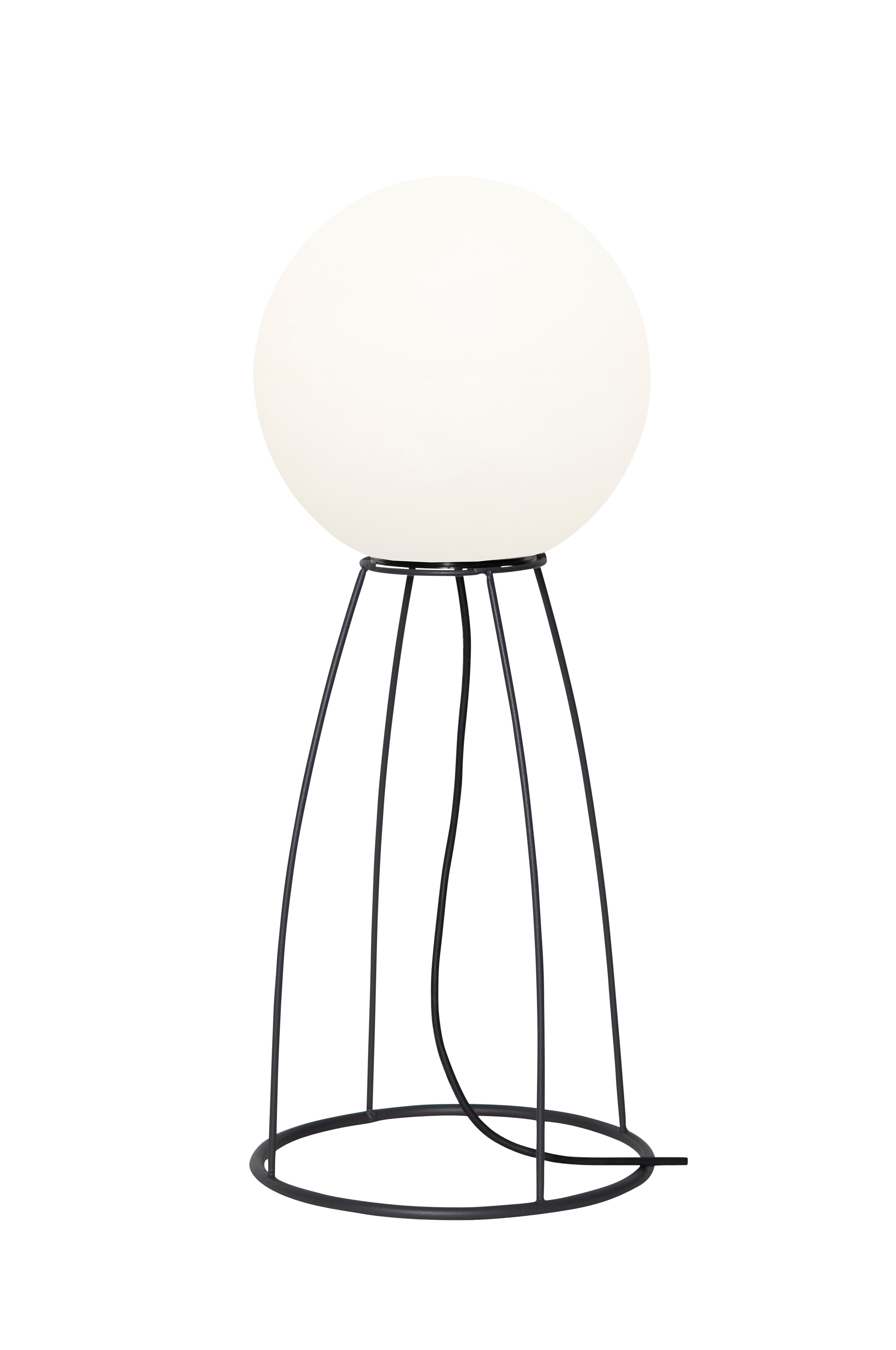 Golvlampa för utomhusbruk på svart stativ med vit skärm. Lampan går lika bra att använda utan stativ. Svart anslutningskabel, sladdlängd 3 m.