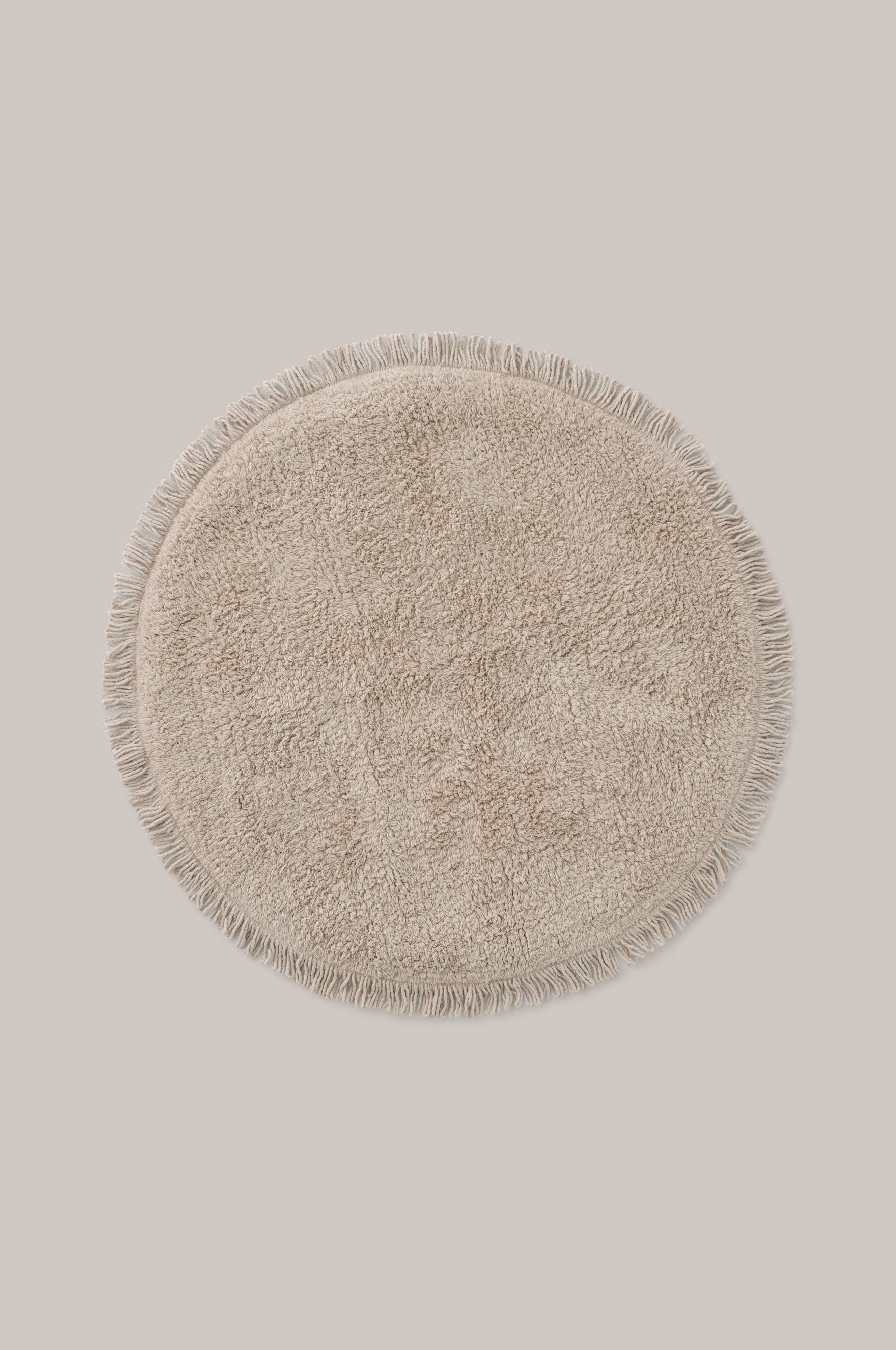 Rund, tuftad badrumsmatta med fransar runt om. Diameter 70 cm.