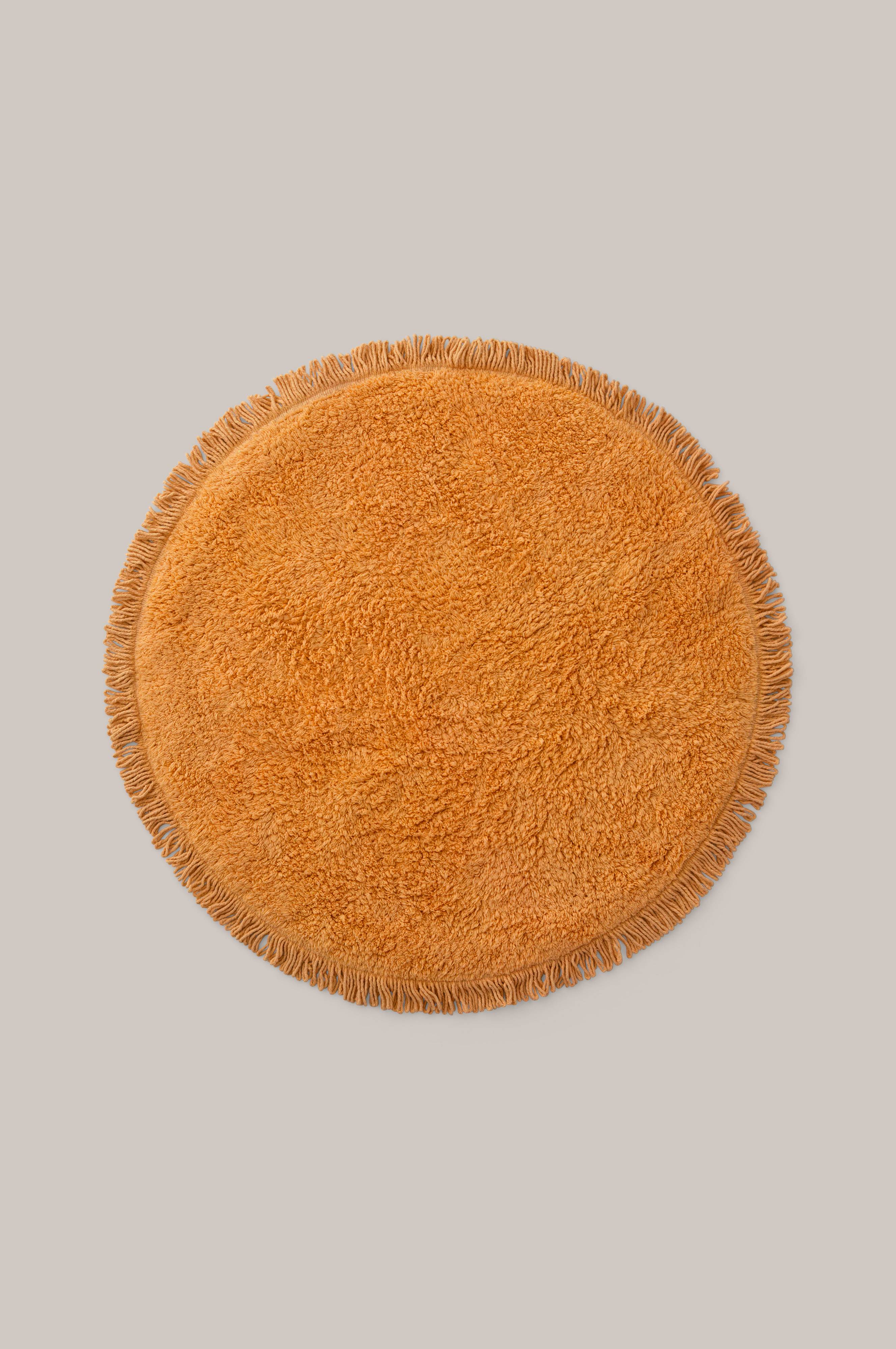 Rund, tuftad badrumsmatta med fransar runt om. Diameter 70 cm.