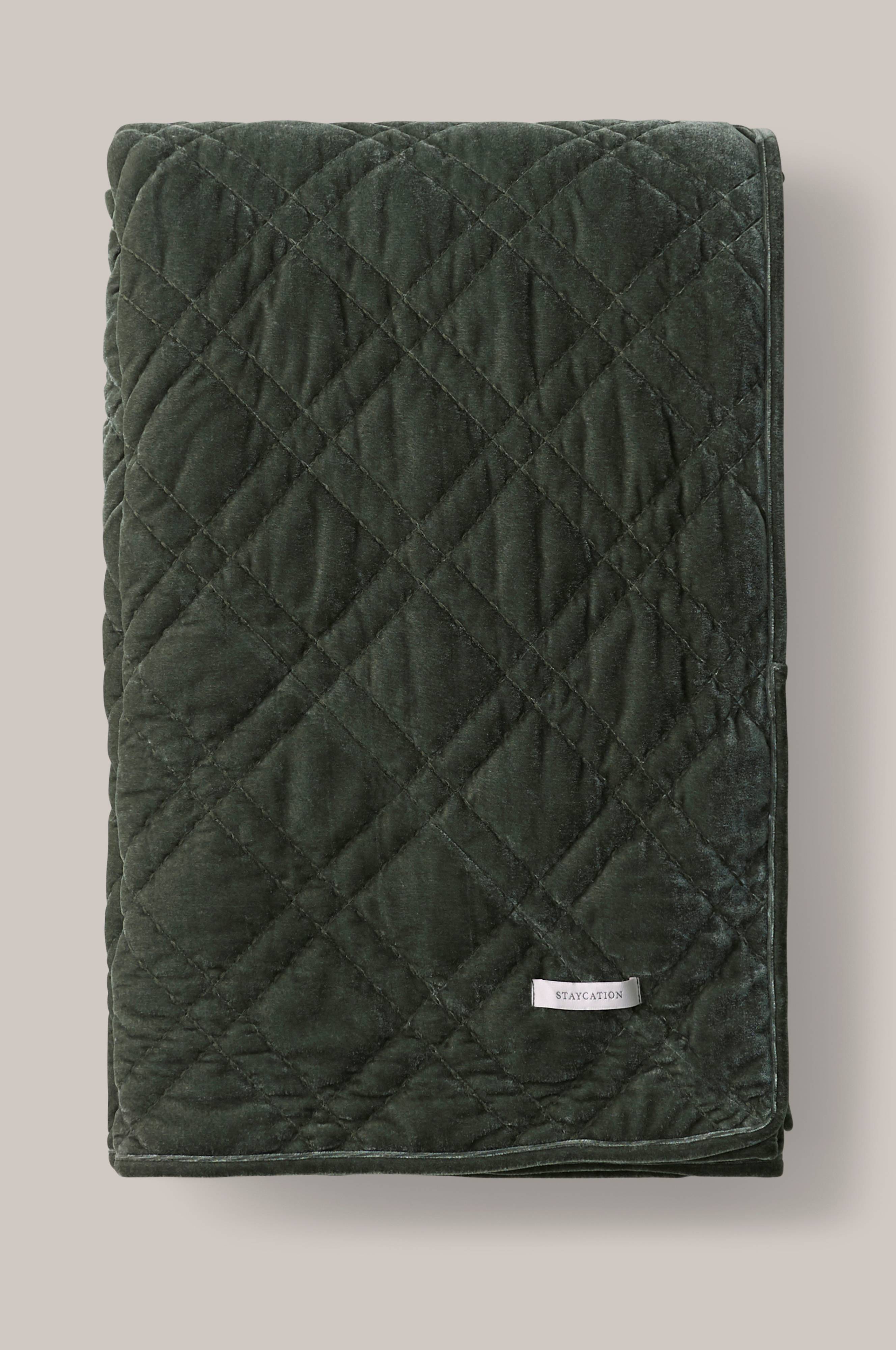Quiltat överkast med framsida i krossad sammet med fin lyster. Baksida av bomull. Fyllning av 120g polyester.