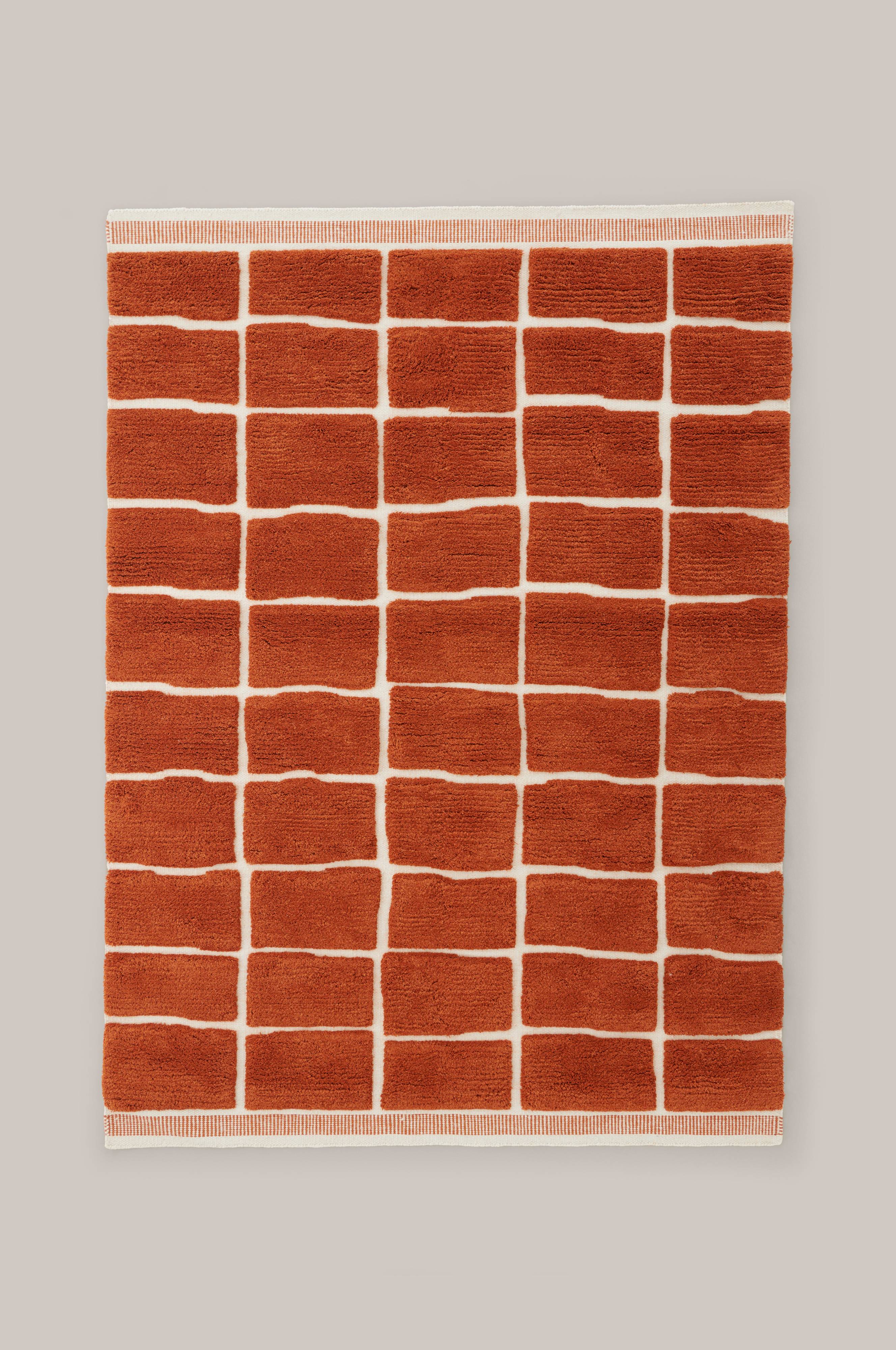 Ullmatta med tuftat mönster med oregelbundna rutor på svart botten. Breda, vävda bårder vid kortsidorna. Varp i bomull. Mattans tjocklek 2,5 cm.