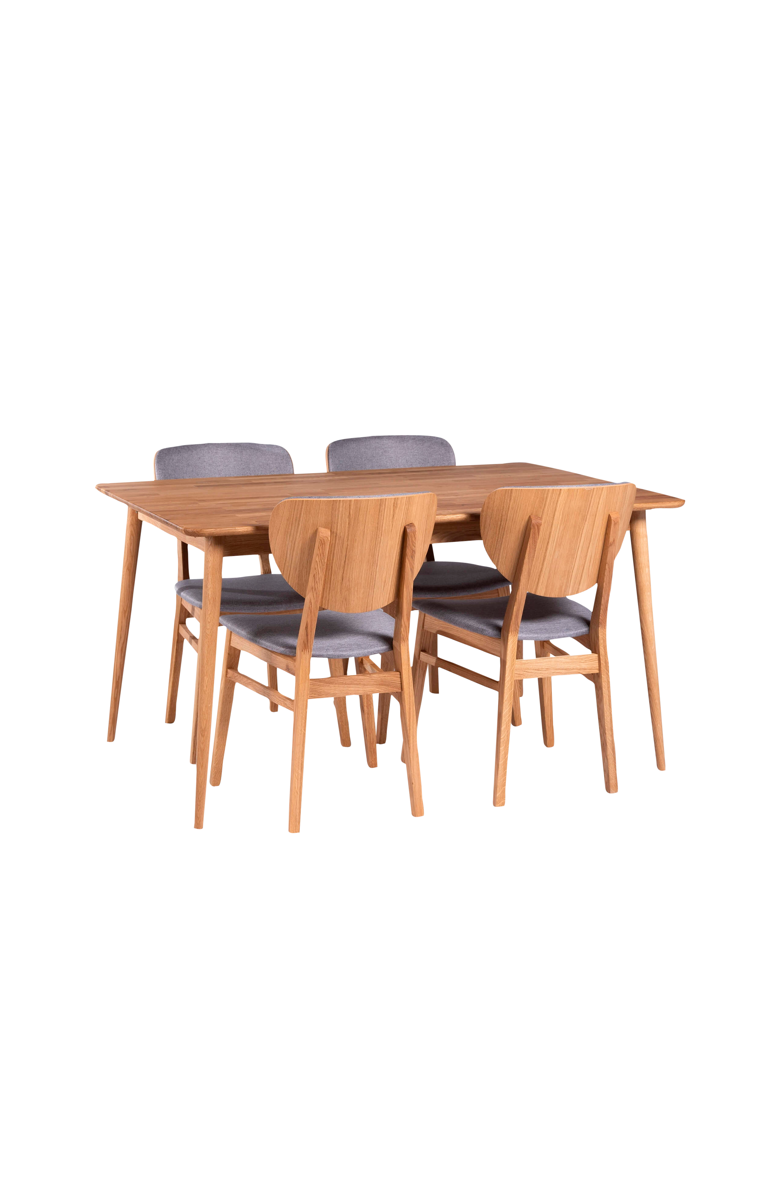 Elegant matgrupp med bord i massiv ek och 4 matchande stolar i massiv ek. Bordet går att komplettera med insticksklaff på båda sidor om man vill, praktiskt när ni blir många till bordet.