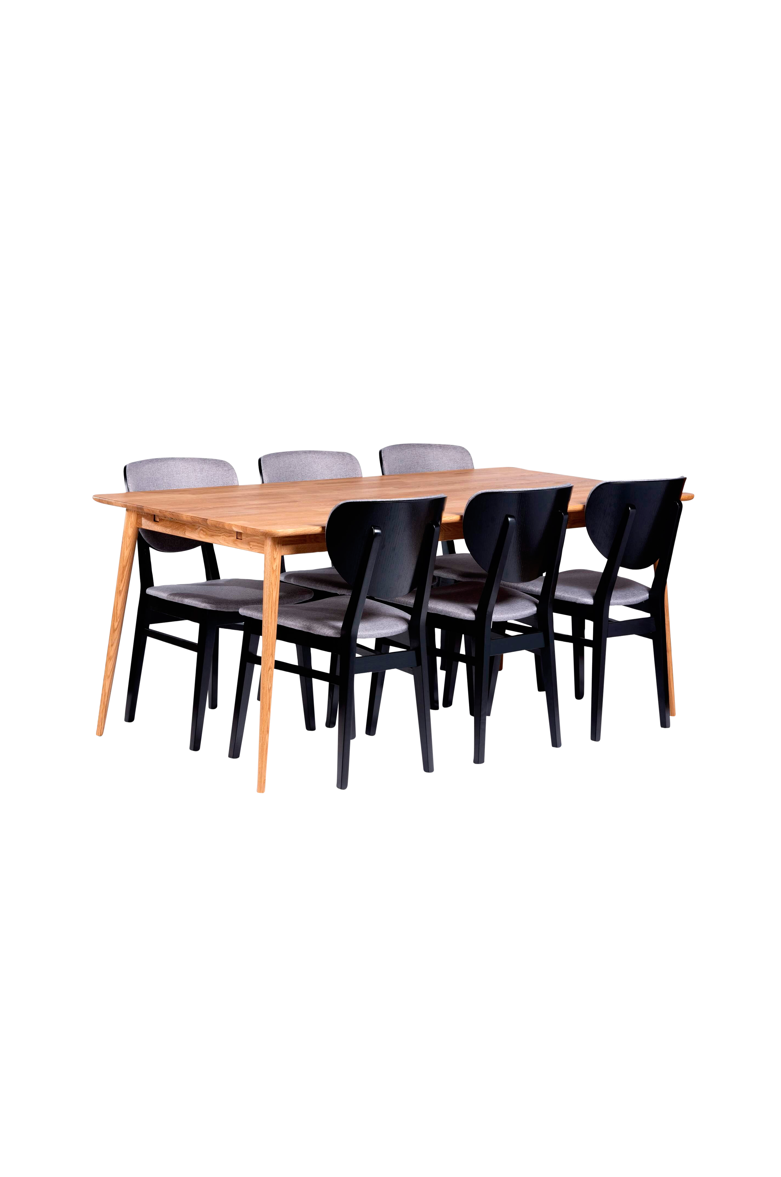 Elegant matgrupp med bord i massiv ek och 6 svarta stolar i massiv ask. Bordet går att komplettera med insticksklaff på båda sidor om man vill, praktiskt när ni blir många till bordet.