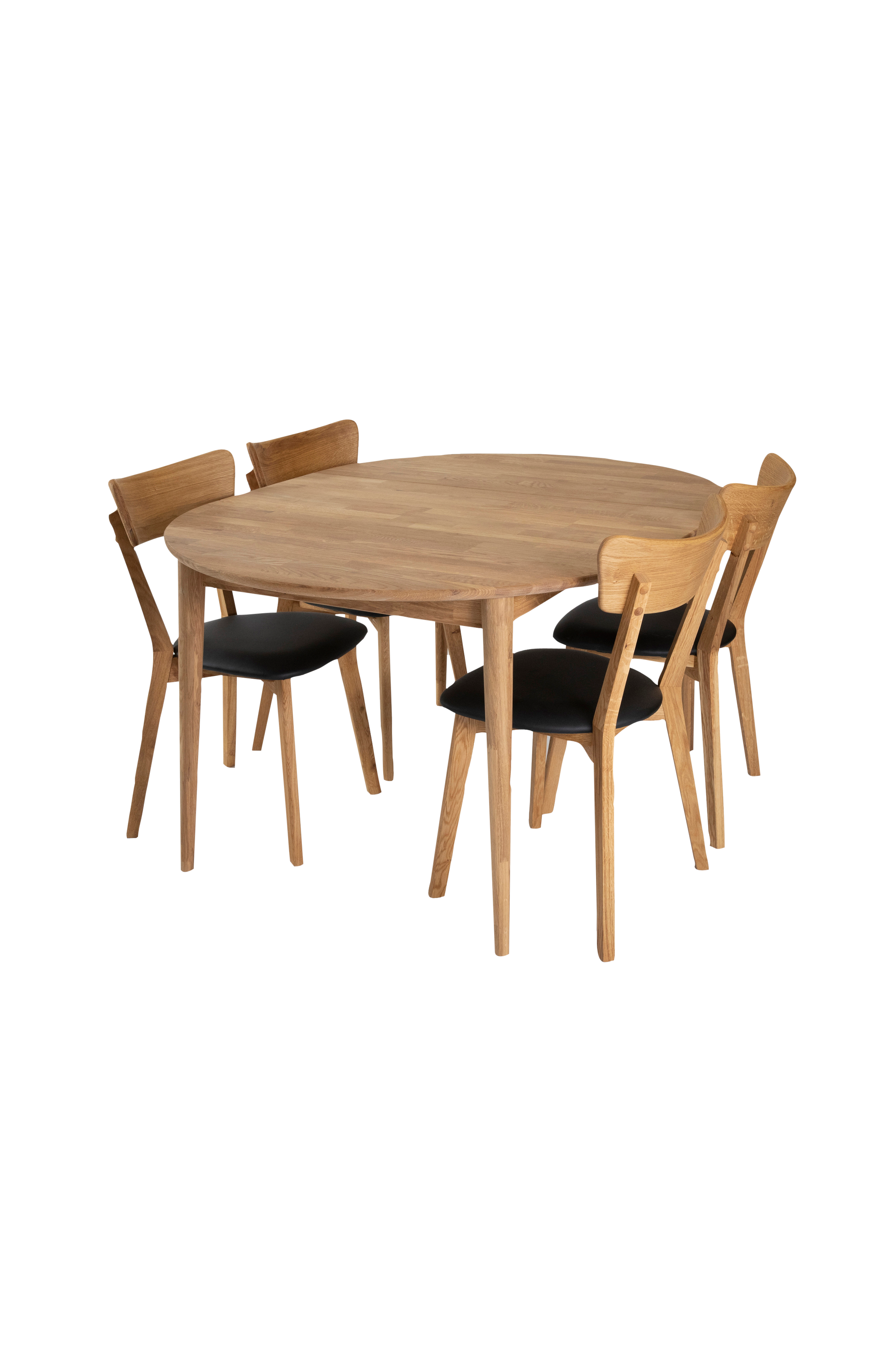 Matgrupp alborg i massiv oljad ek med 4 växjöstolar diameter på bordet är 110 cm,med förlängningsskivan som ingår blir bordet hela 150 cm långt.