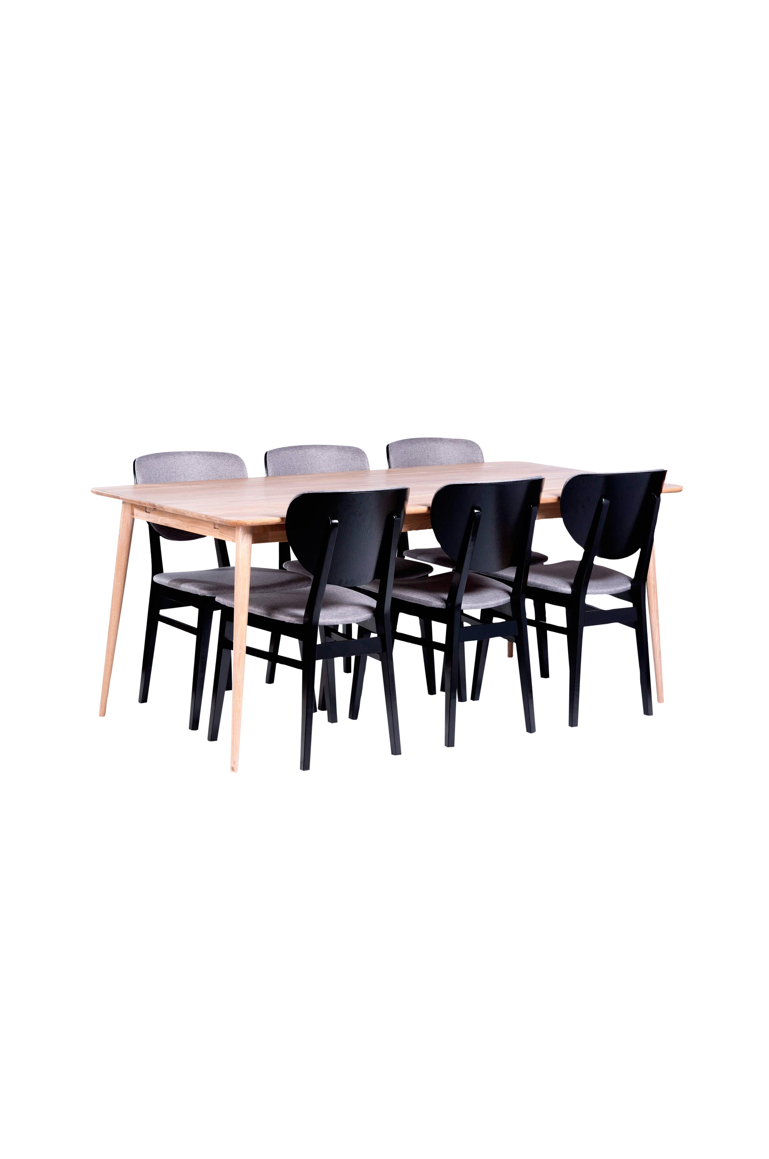 Elegant matgrupp med bord i massiv vitoljad ek och 6 svarta stolar i massiv ask. Bordet går att komplettera med insticksklaff på båda sidor om man vill, praktiskt när ni blir många till bordet.