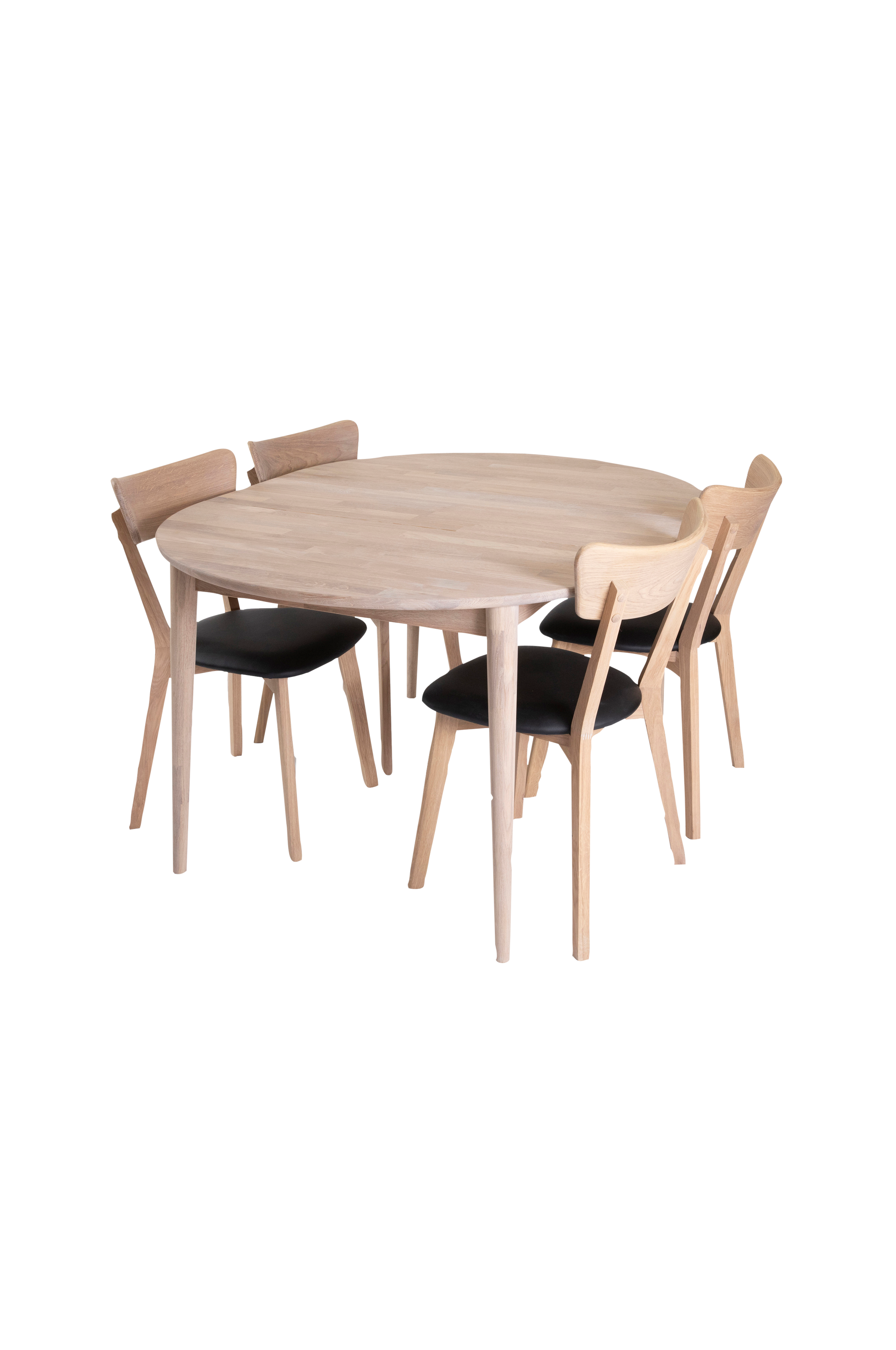 Matgrupp odense i massiv vitoljad ek med 4 eksjö stolar diameter på bordet är 110 cm,med förlängningsskivan som ingår blir bordet hela 150 cm långt.