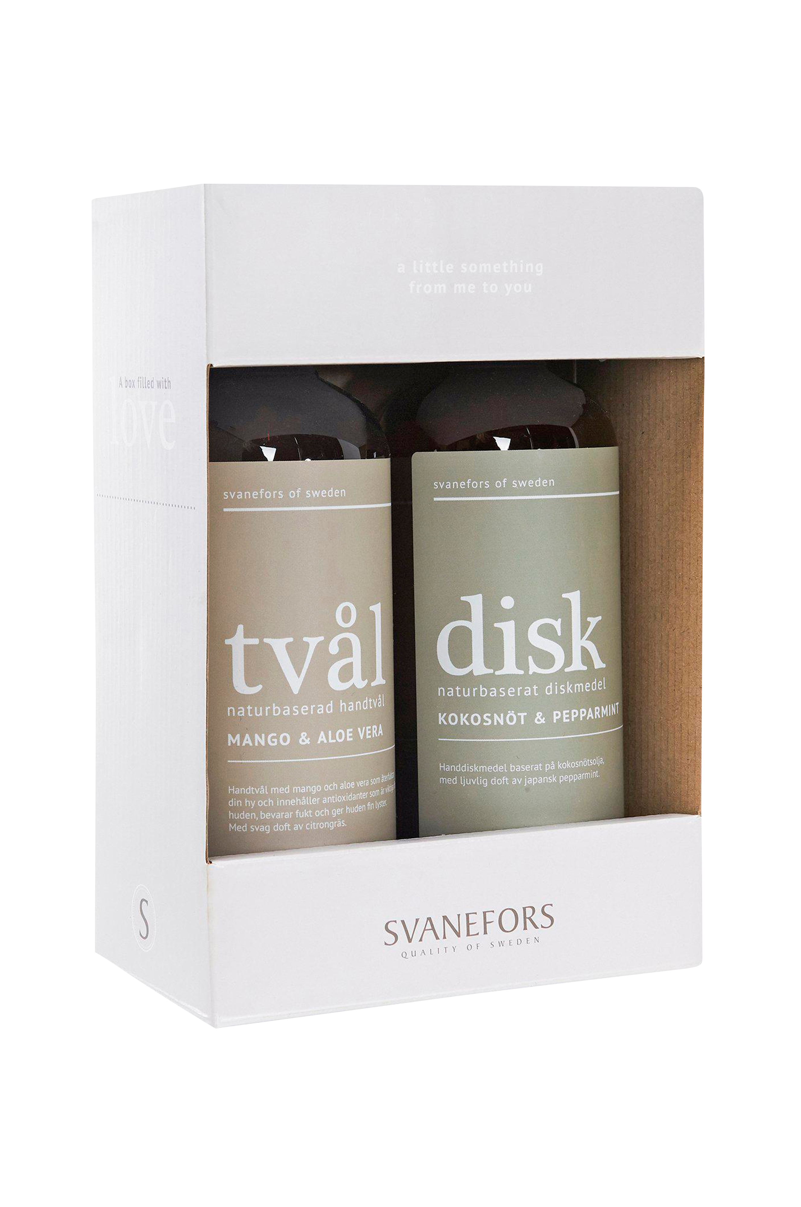 Handtvål och Diskmedel i fin presentförpackning. Handtvål med mango och aloe vera som återfuktar din hy. Innehåller antioxidanter som är viktiga för huden, bevarar fukt och ger huden fin lyster. Handdiskmedel baserat på kokosnötsolja som skonsamt rengör utan att lämna dina händer torra och röda. Innehåller även japansk pepparmint som har en ljuvlig fräsch doft. Båda flaskorna innehåller 500ml.