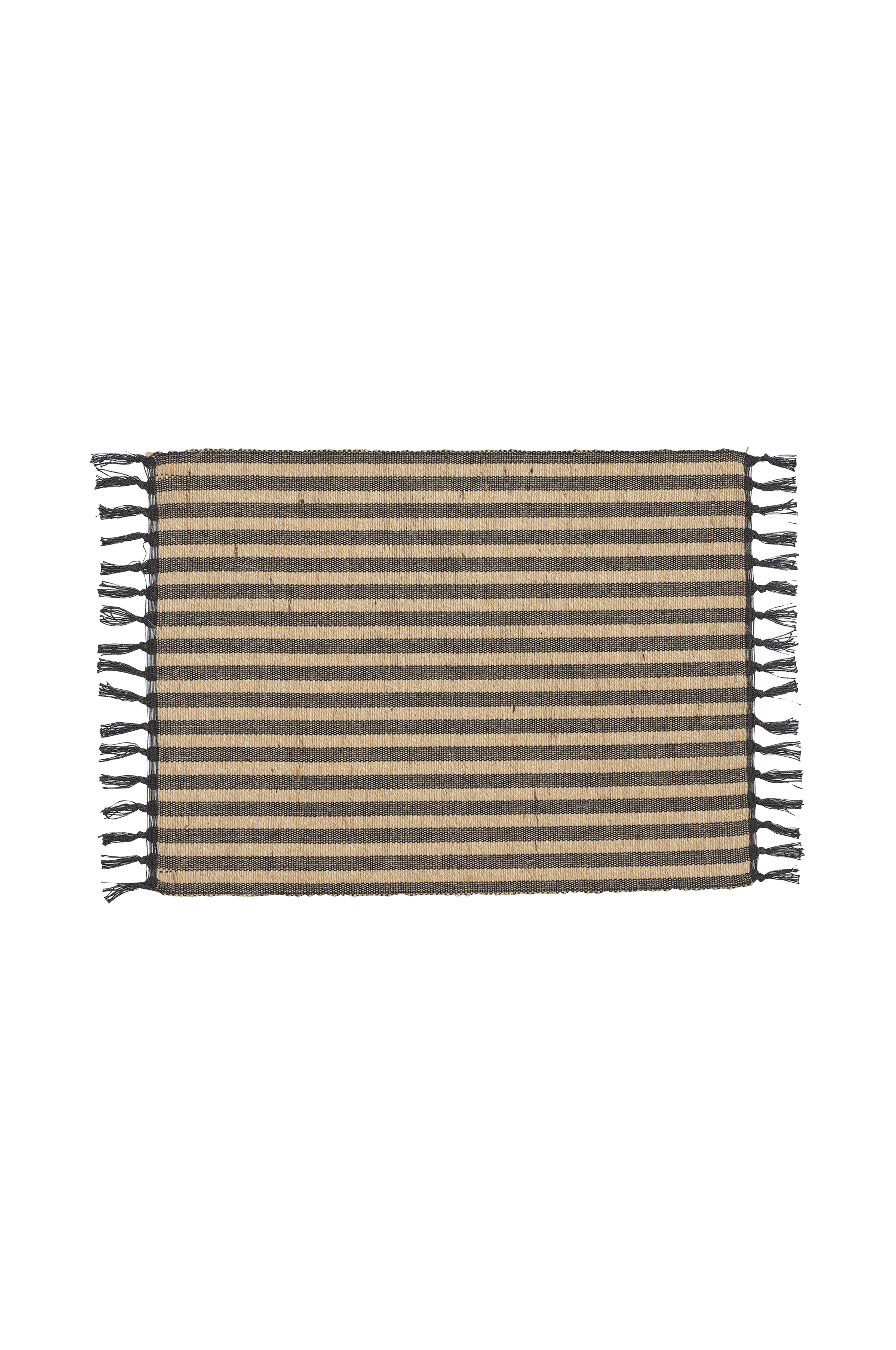 Vävd platsmatta med randig design i bomulls-/jutegarn och fransar. Storlek 33x45cm exklusive fransar. Produkten är certifierad enligt standard 100 by oeko-tex®. Certifieringen garanterar att produkten är testad och fri från ämnen som kan vara skadliga för hälsa och miljö.