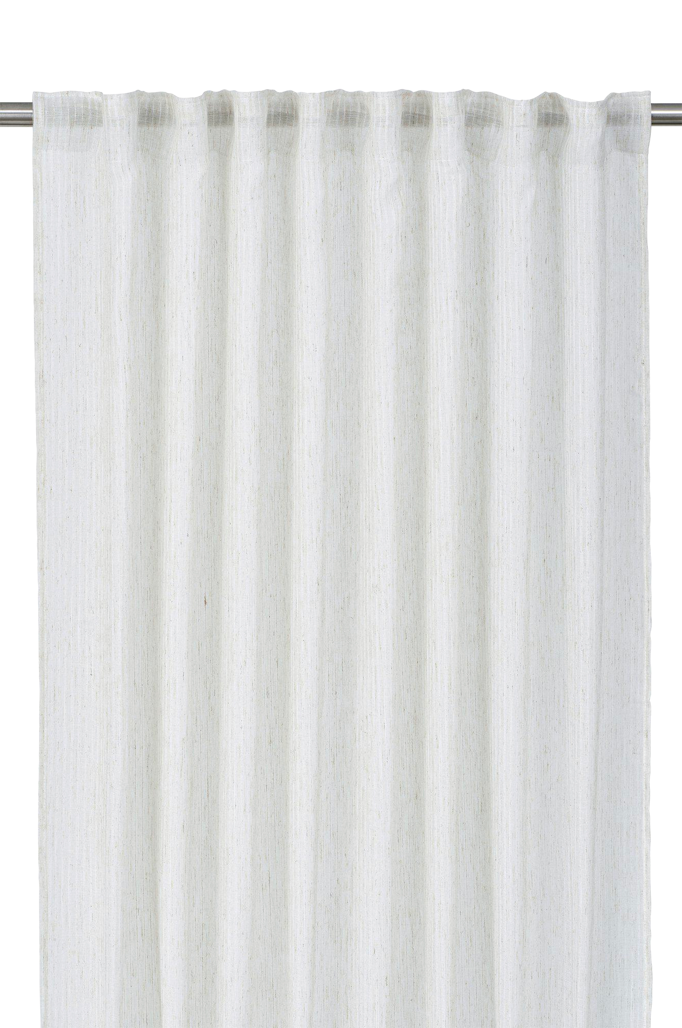 1-pack gardiner för stora fönster i ett skirt tyg som filtrerar ljuset. Tyget har en vävd rand med olika textur som ger ett randigt utseende även om det är enfärgat. Har multiheadtejp upptill, sydda långsidor och overlocksöm nedtill. Använd easy fix-tejp för att justera längden efter behov. Multiheadtejpen är en flexibel lösning som gör att gardinen kan hängas med metallkrokar eller direkt på stången beroende på vilken plisseeffekt som önskas. Måttet för varje gardin är 300x280cm. Produkten är certifierad enligt standard 100 av oeko-tex®. Certifieringen garanterar att produkten är testad och fri från ämnen som kan vara skadliga för hälsa och miljö.