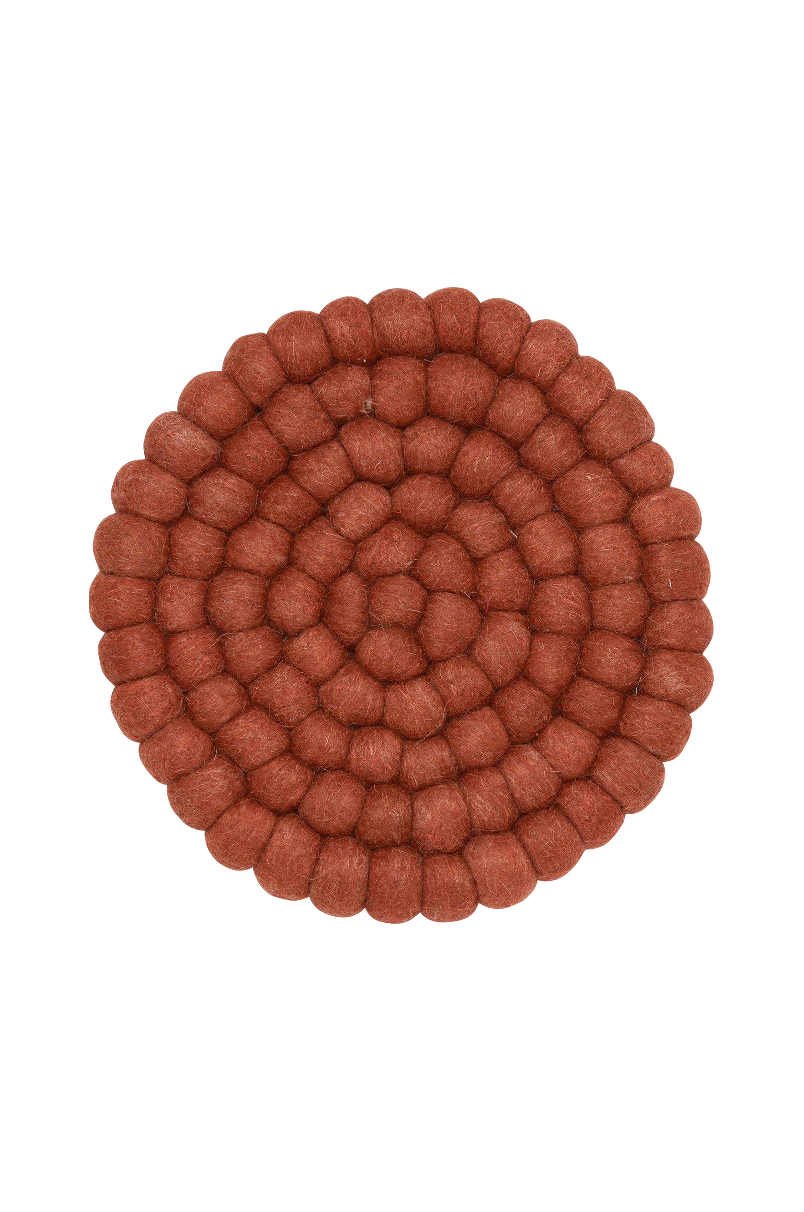 Snyggt grytunderlägg i ull med tovade bollar. Passar lika fint att ha under grytan som till dekoration.
