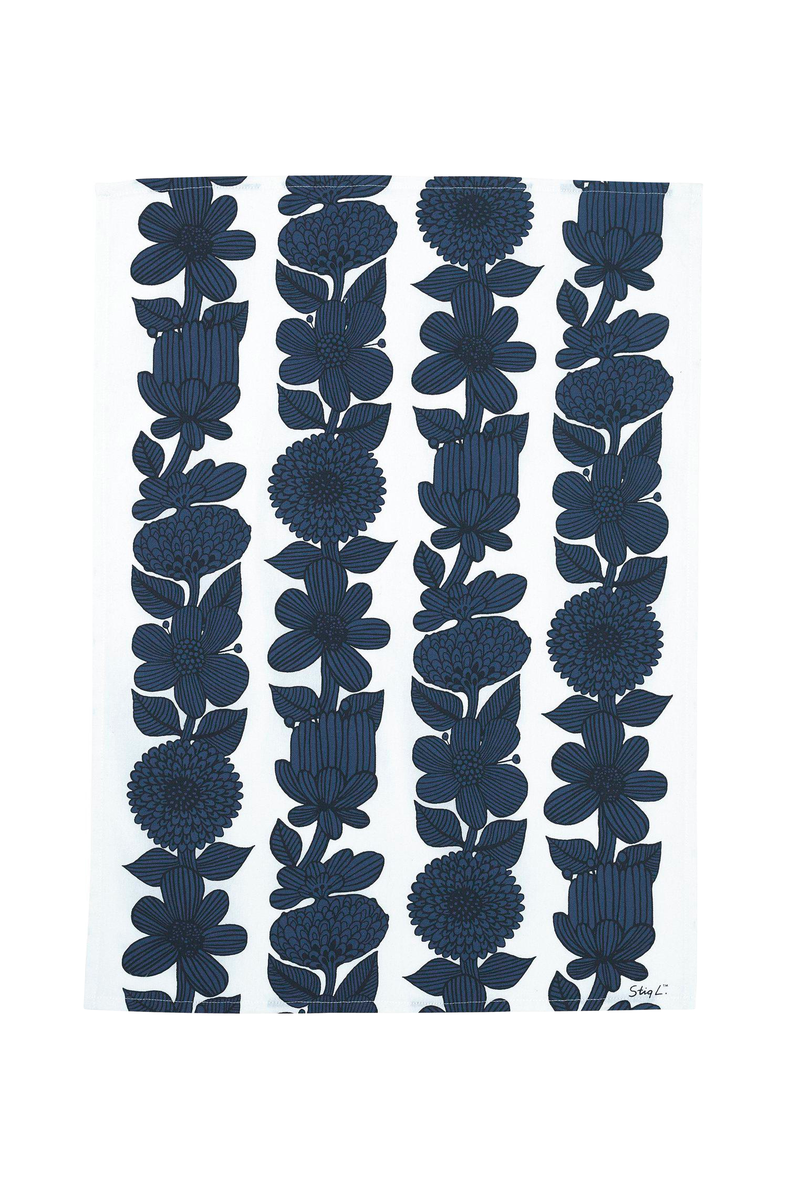 Kökshandduk, med tryckt mönster och en färgmatchad hank, av den välkända designern Stig Lindberg.