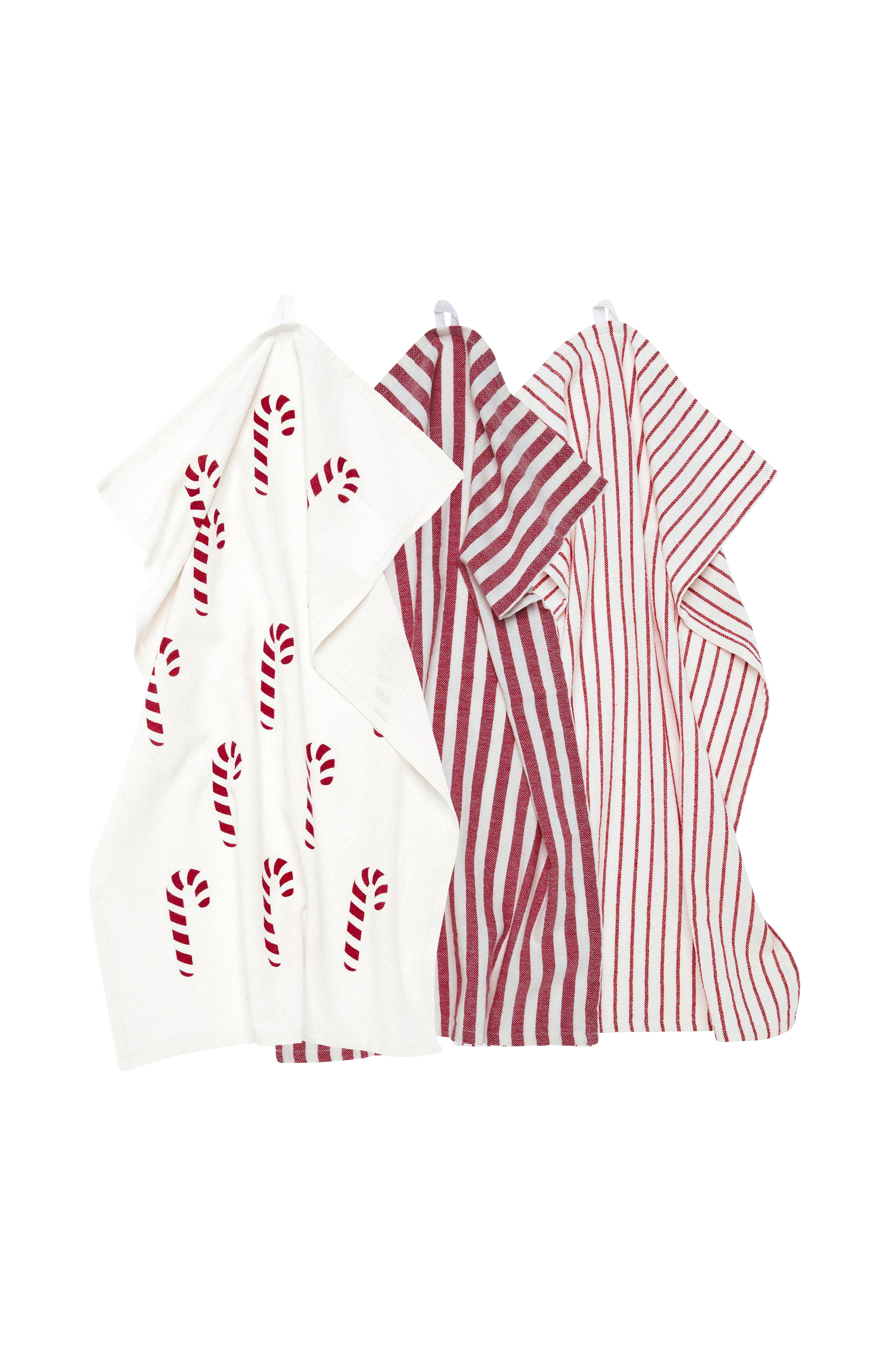 3-pack kökshanddukar med två garnfärgade ränder samt ett tryckt motiv. Kökshandduken i mjuk bomull har en lätt tvättad effekt. Mått 47x70cm.