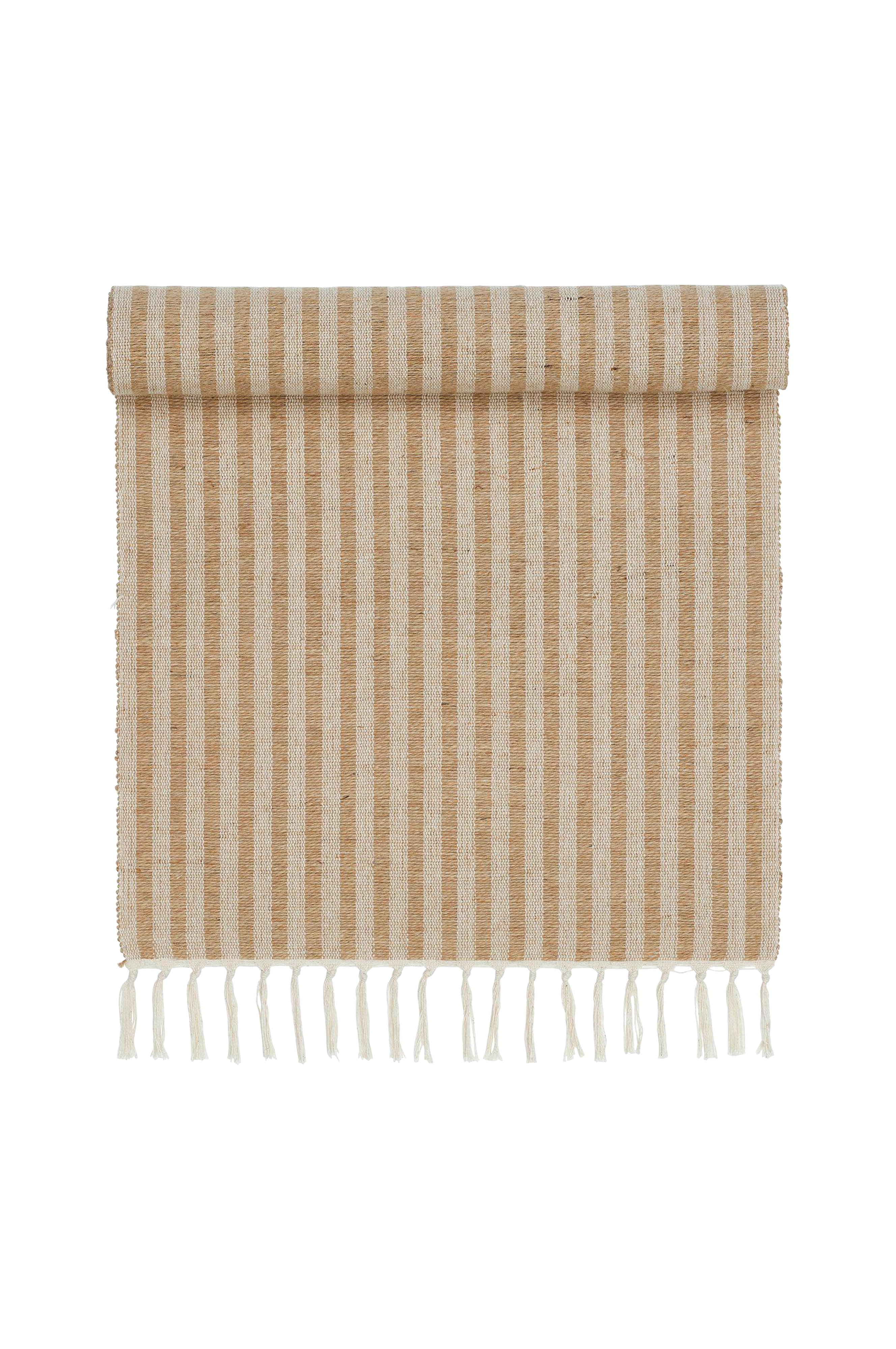Randig bordslöpare i bomull/jute och frans. Storlek 33x120cm exklusive frans. Produkten är certifierad enligt standard 100 by oeko-tex®. Certifieringen garanterar att produkten är testad och fri från ämnen som kan vara skadliga för hälsan och miljön. 50% jute, 50% bomull.