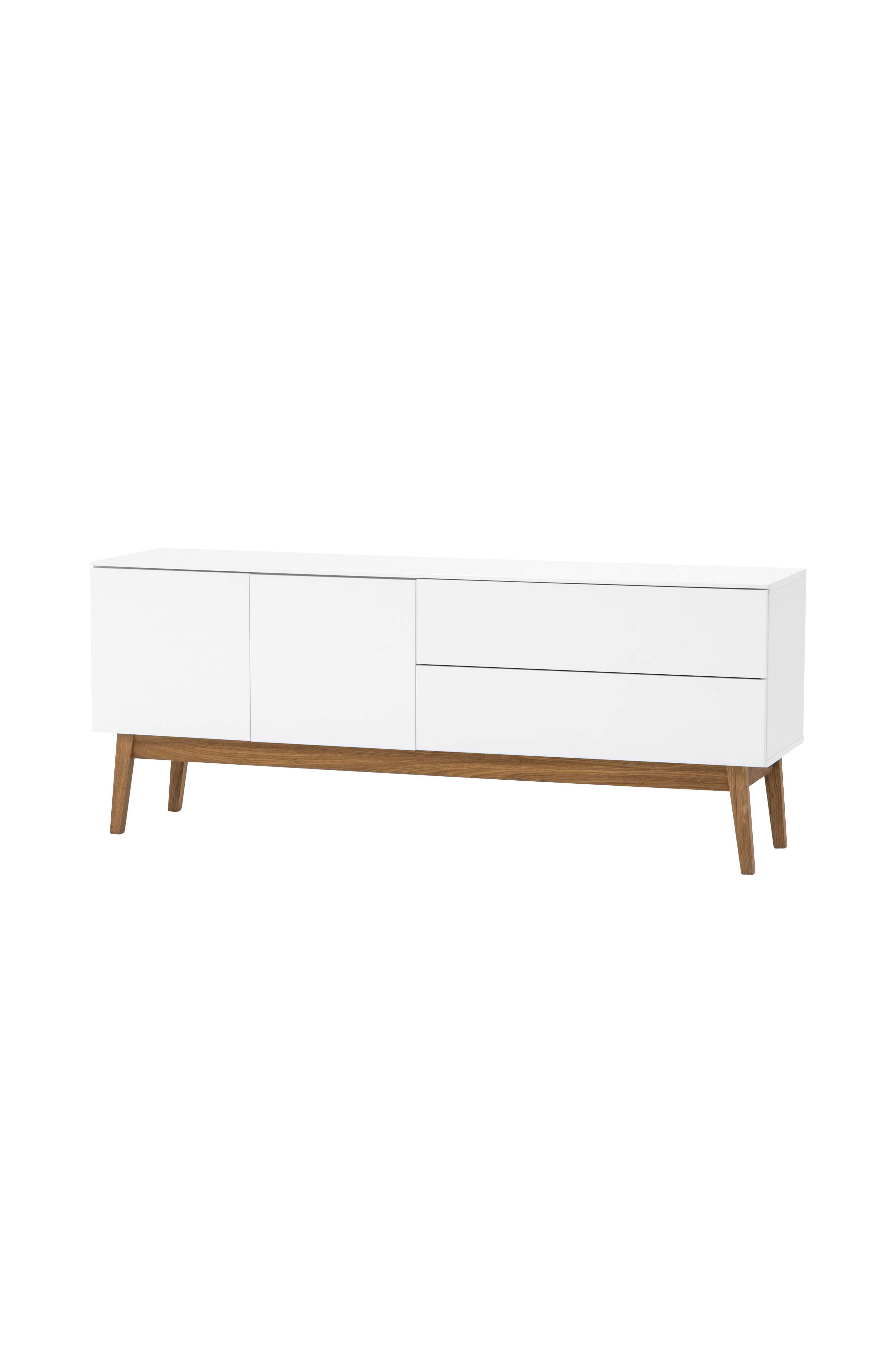 Mediabänk i vitt med underrede i massiv oljad ek. 2 trädörrar och 2 lådor. Bredd 160 cm. Djup 40 cm. Höjd 64 cm. Vikt 45 kg.